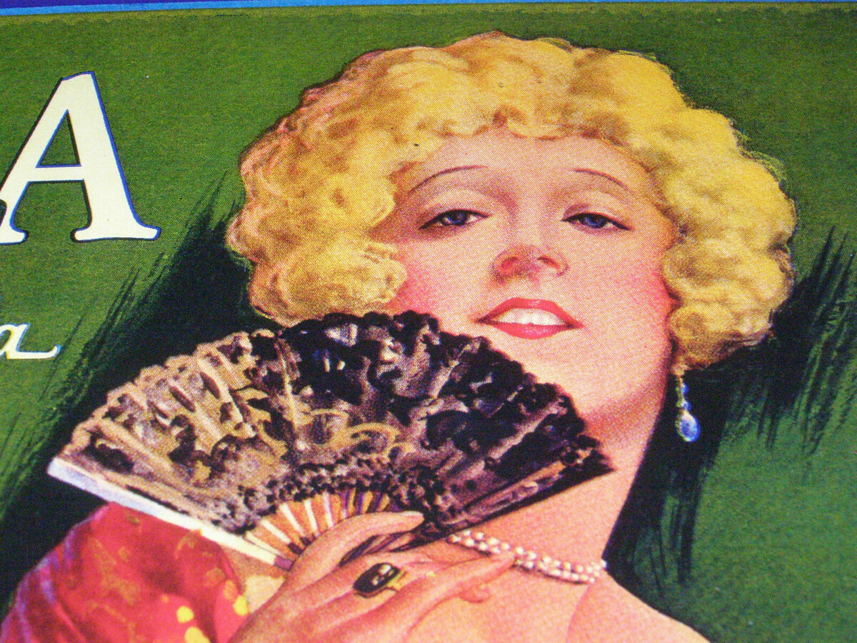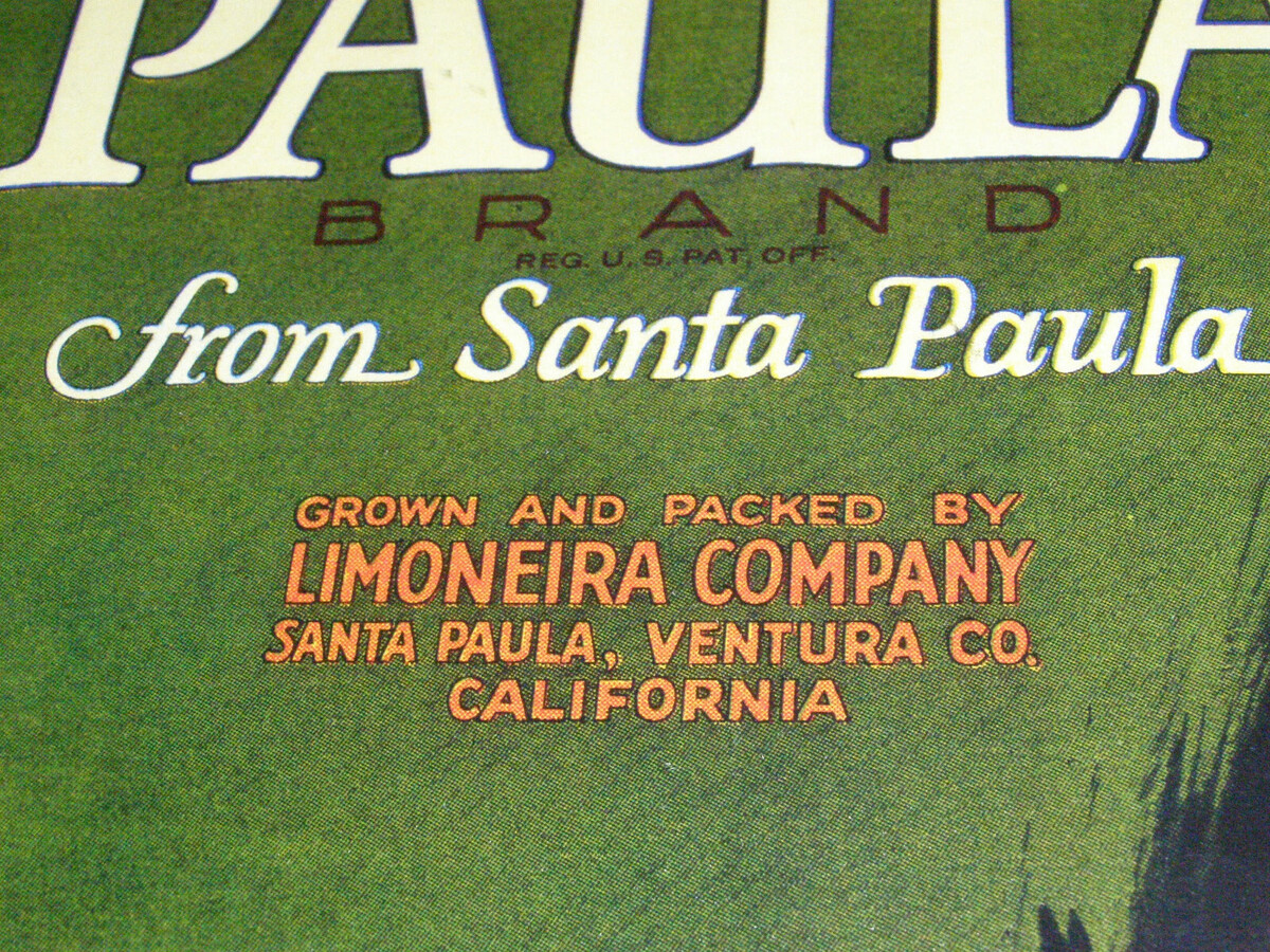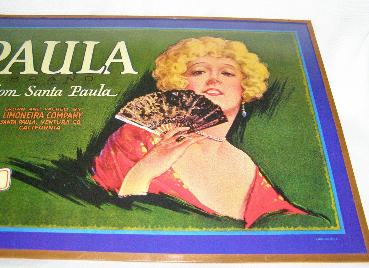 This vintage "PAULA" Orange Crate Label is an original 1920?s printed Valencia Orange crate label. The grower and packer was the Limoneira Company, of Santa Paula, Ventura County, California. ?Limoneira? is Portuguese for lemon lands. The company was founded in 1893. The image is of a blond haired ?Señorita?, holding a small lace fan. The label is mounted under glass, with a hanger and illustration board backing, and sealed with copper foil on the edges. It is marked: ?COPYRIGHT, 1928 BY LIMONEIRA CO.? in the lower left. The lower right has the name of the printing company: ?SCHMIDT LITHO CO L.A.?