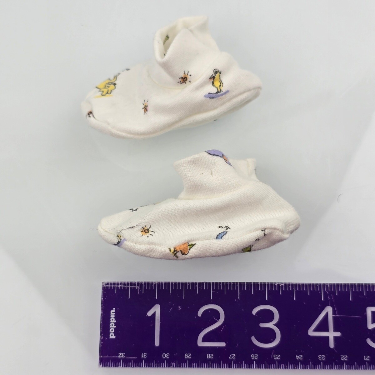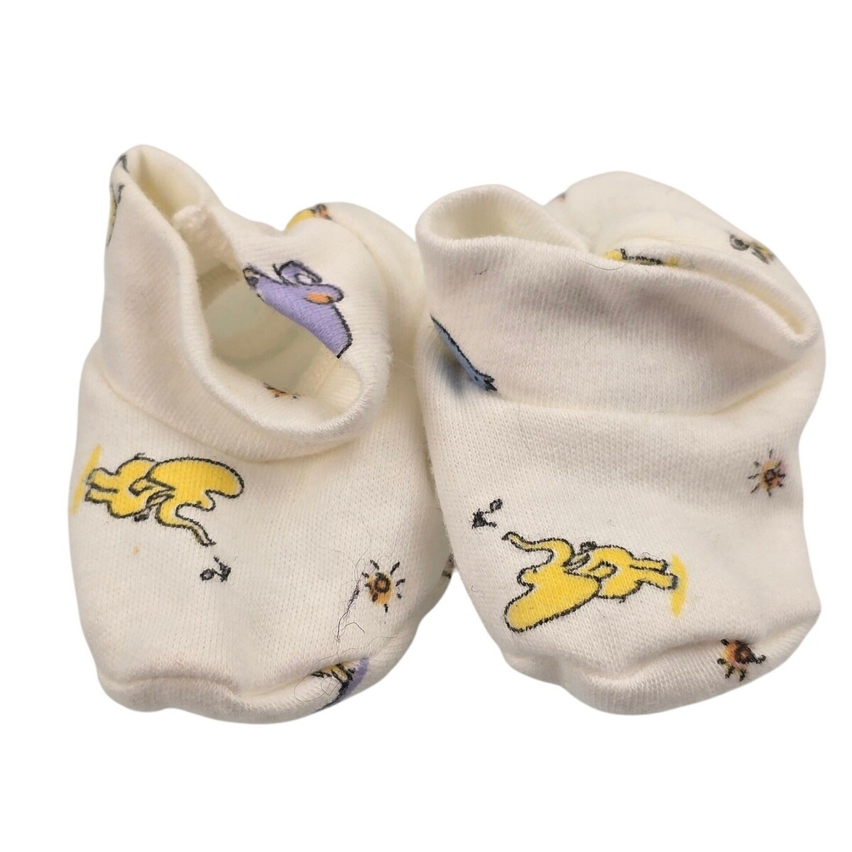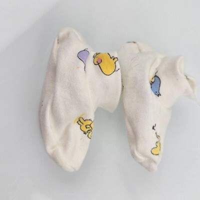 Keywords: baby socks, booties, newborn shoes, infant booties, cartoon print, yellow, blue, 100% cotton, layette, baby accessories, unisex baby, soft sole, crib shoes