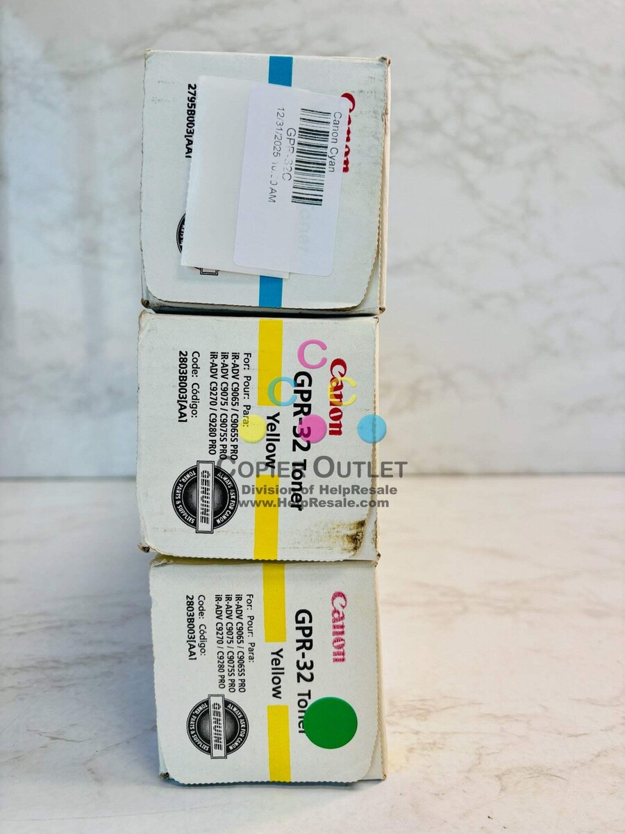 Lot Of 3 Genuine Canon GPR-32 Cyan Yellow Toner (No Magenta Black) New Same Day Shipping FOR imageRUNNER ADVANCE C9065 PRO, C9075 PRO, C9270 PRO, C9280 PRO Listed By: Renee (Sales Team) ?You cannot become who you want to be by remaining who you are? Max Depree (A positive moment brought to you by Help Resale) Copier Outlet (A Division of Help Resale) Copier Outlet was established in 1993. We buy and sell both domestically and internationally and have wide assortment of copiers, consumable and accessories of all popular brands. All of our copiers are in house and available for your inspection. They all have been tested and rated for functions, cosmetics and overall appearance. Our consumable and accessories selections include toners, imaging units, developers and copier parts such as fax board, fixing unit, fuser unit, roller, cleaning brush, drum blades and etc. For more detailed information on our copiers, consumables and accessories, please feel free to give us a call. We are more than happy to assist you with the pricing and guide you to find the copiers, consumable and accessories you wish to buy. Best Regards, Copier Outlet Sales Team Monday - Friday: 9:00 am to 5:00 pm (PST) Copier Outlet Promo Video - YouTube Video will open in a new windowUsing the App? Paste link into a browser window: [isdntekvideo] All product and company names are trademarks TM or registered trademarks of their respective holders. Use of them does not imply any affiliation with or endorsement by them.