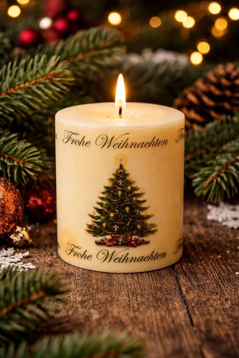 Decorative Christmas pillar candle featuring a traditional holiday tree design and the German greeting ?Frohe Weihnachten.? The candle is new and unused, still wrapped, with original manufacturer label on the base. Made in the EU. A nice seasonal decor piece for holiday displays, candle groupings, or gift giving.