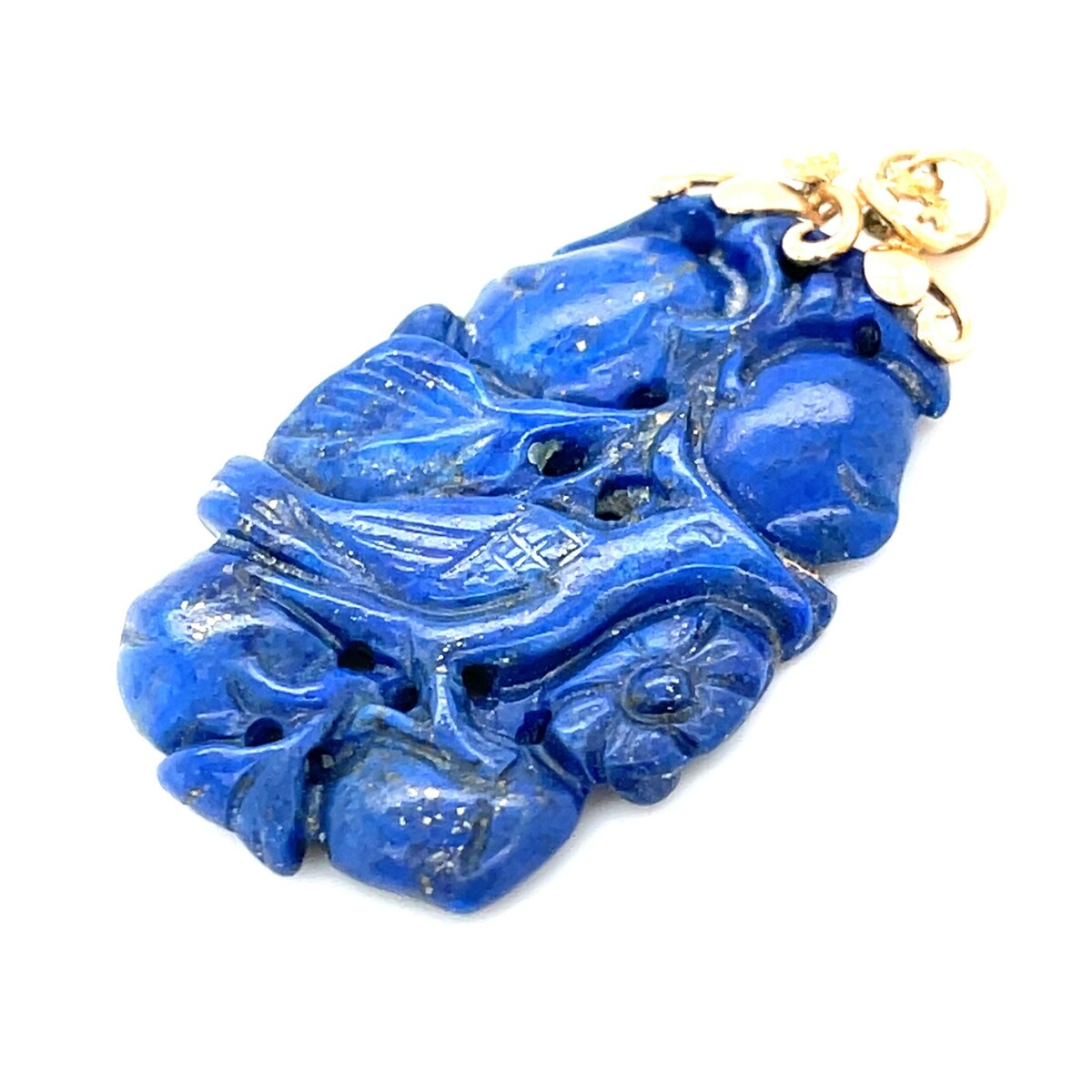 Beautiful Chinese carved natural lapis lazuli pendant set with 14K solid yellow gold bail and detailing.
