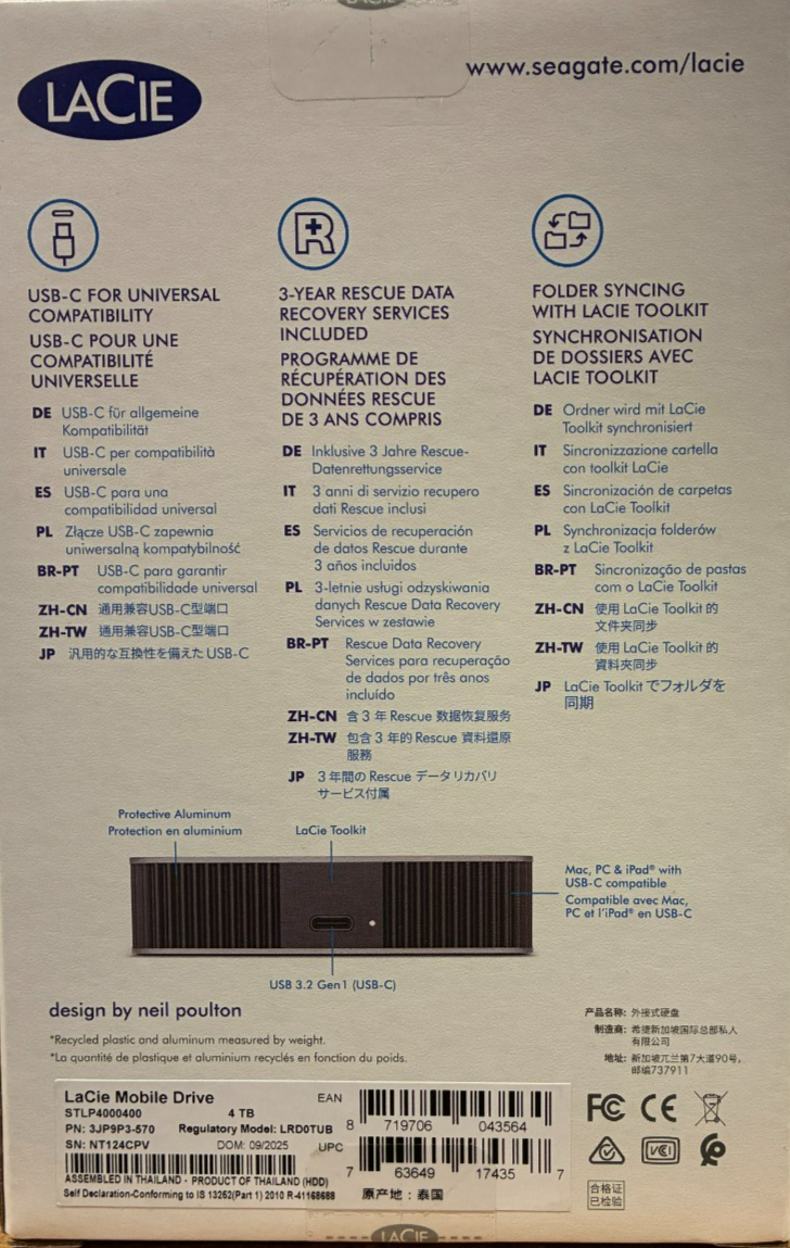 LaCie Mobile Drive is the nexus of portability and capacity. Encased in a sleek Neil Poulton design, each drive is constructed using post-consumer recycled materials. Work with PC, Mac, and iPad USB-C, just plug-in and go. One-click or automatic backup makes file storage extra smooth, plus up to 5 TB of capacity makes plenty of room for photos, playlists, docs and more.