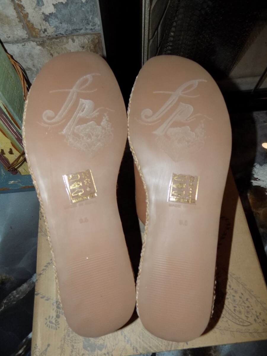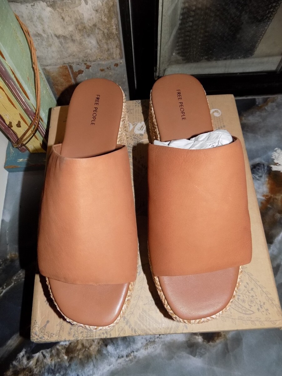 The product is a pair of Free People Taupe Harbor Raffia Flatform Sandals in size 9.5 for women. These slip-on sandals feature a bohemian style with a mid-height leather heel, making them perfect for a casual and trendy look. The raffia material and brown color add a touch of natural and earthy charm, while the brand name Free People ensures a high-quality and stylish shoe. Ideal for those who love a fashionable and comfortable sandal option.