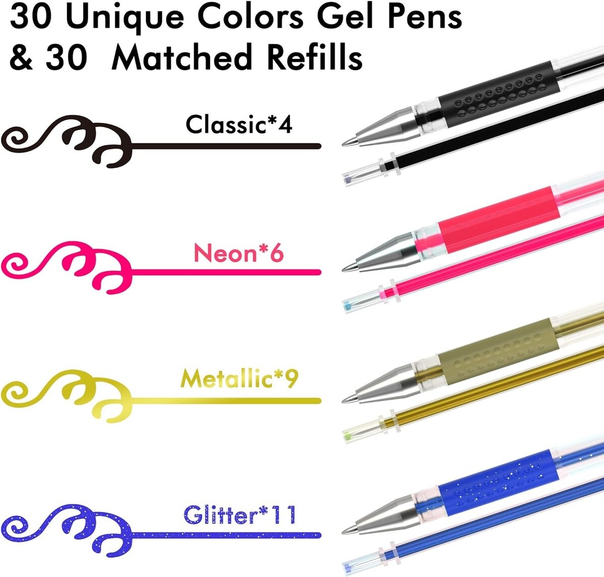 ASSORTED COLORS: 60 Pack Unique Gel Pen Set contains 30 INDIVIDULE colors and 30 matched refills in the gift box! Ink colors include 4 classic ,6 Neon,9 Metallic and 11 Glitter which brings much more fun for Adult book Coloring, Scrap booking, Sketching, Doodling, Drawing, Writing, and all the other art designs.