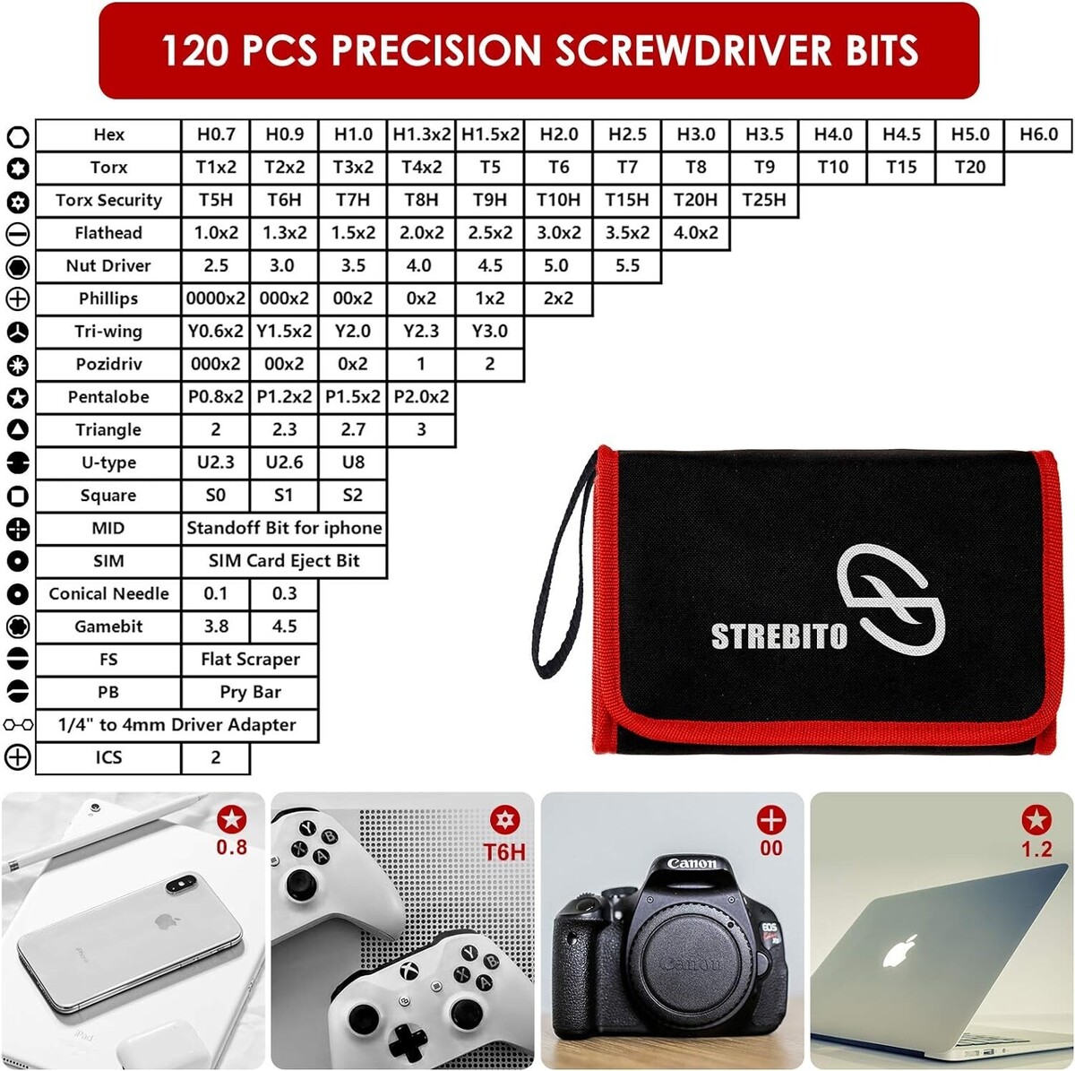 ?Wide Application?This precision screwdriver set has 120 bits, complete with every driver bit you?ll need to tackle any repair or DIY project. In addition, this repair kit has 22 practical accessories, such as magnetizer, magnetic mat, ESD tweezers, suction cup, spudger, cleaning brush, etc. Whether you're a professional or a amateur, this toolkit has what you need to repair all cell , computer, laptops, SSD, iPad, game consoles, tablets, glasses, HVAC, sewing machine, etc