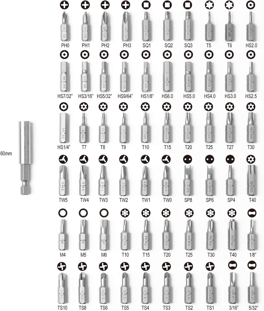 Specification:(4)Phillips:0,1,2,3;(3)Square: 1,2,3; (3)Spanner: 4, 6, 8;(6)Temper Proof Metric Hex: ,,,,,; (6)Temper Proof SAE Hex: 1/4",3/16",7/32",1/8",9/64",5/32?;(2)Torx Star:T5,T6;(10)Temper Proof Torx Star: T7, T8, T9, T10, T15, T20, T25, T27, T30, T40 ;(3)Clutch: 1/8", 5/32",3/16"(3)Spline: M4, M5, M6;(6)Tri wing: 0,1,2,3,4,5; (8)TORQ SET: 1, 2, 3,4, 5, 6, 8,10; (6)Torx ttap: TTAP T10, TTAP T15, TTAP T20, TTAP T25, TTAP T30, TTAP T40; (1) H1/4? magnetic bit holder.