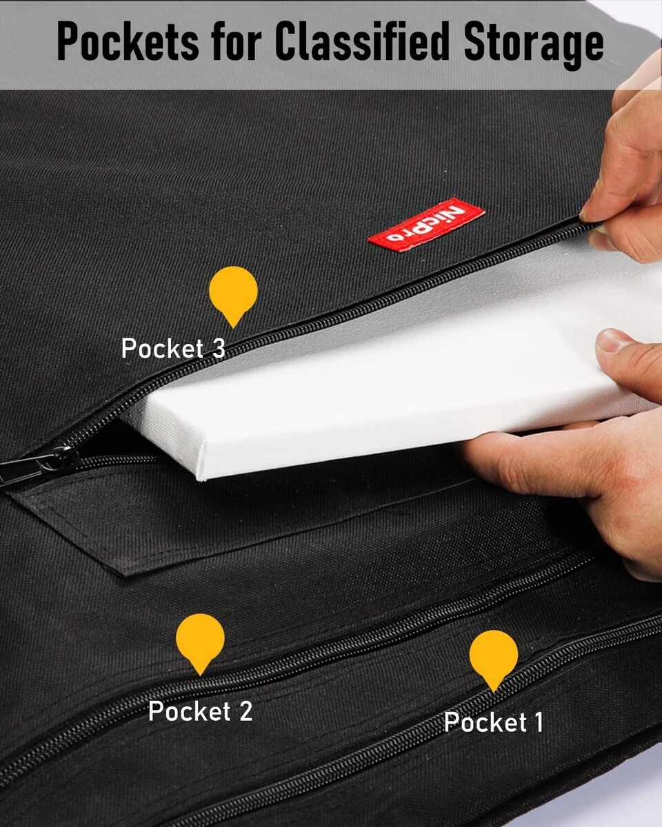 ?Multiple Pockets for Organization?: The portfolio bag features multiple pockets to organize artwork, supplies, and accessories efficiently. This allows artists to separate different pieces or materials within the bag, preventing them from shifting or becoming damaged during transit. Tips: 18" x 24" means it fitting to a 18" x 24" canvas.