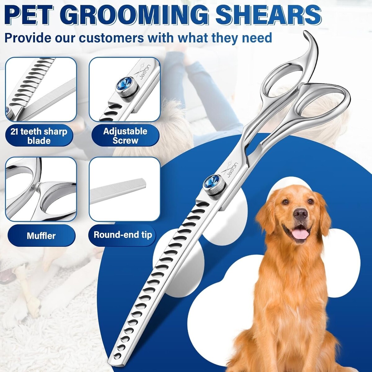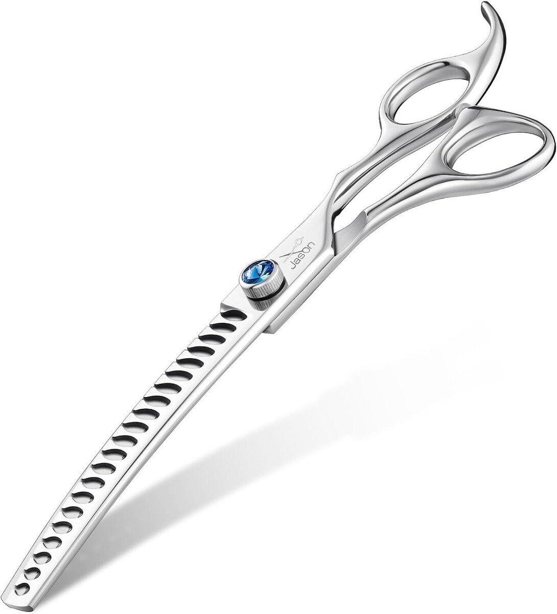 New Design: Curved chunkers for dogs are the newest addition to dog grooming shears. The bigยกTยก shaped teeth allow hair to be pushed away from the cutting blade, giving a much softer and natural finish. Equipped with 21 teeth,this dog shears deliver professional results with 60%-75% thinning rate.