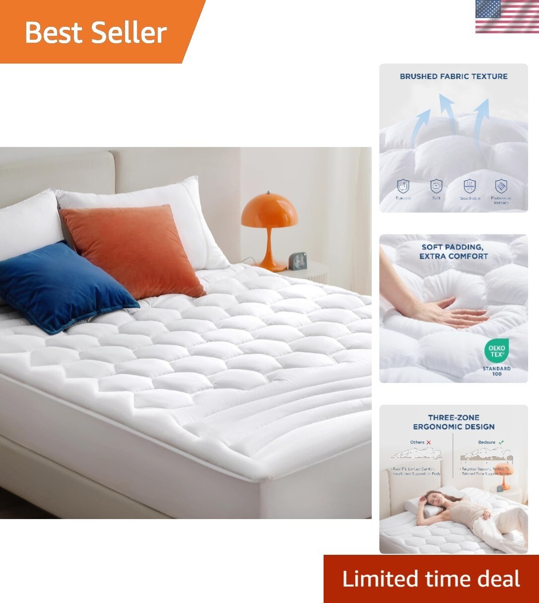 Ergonomic Design: This cal king mattress pad (72x84 Inches) features an ergonomic three-zone design. The top and bottom zones feature a softer wavy design for improved relaxation. The honeycomb-shaped middle quilting provides evenly distributed support that disperses the body?s pressure. Designed to upgrade your stiff mattress to a restorative sleeping space.