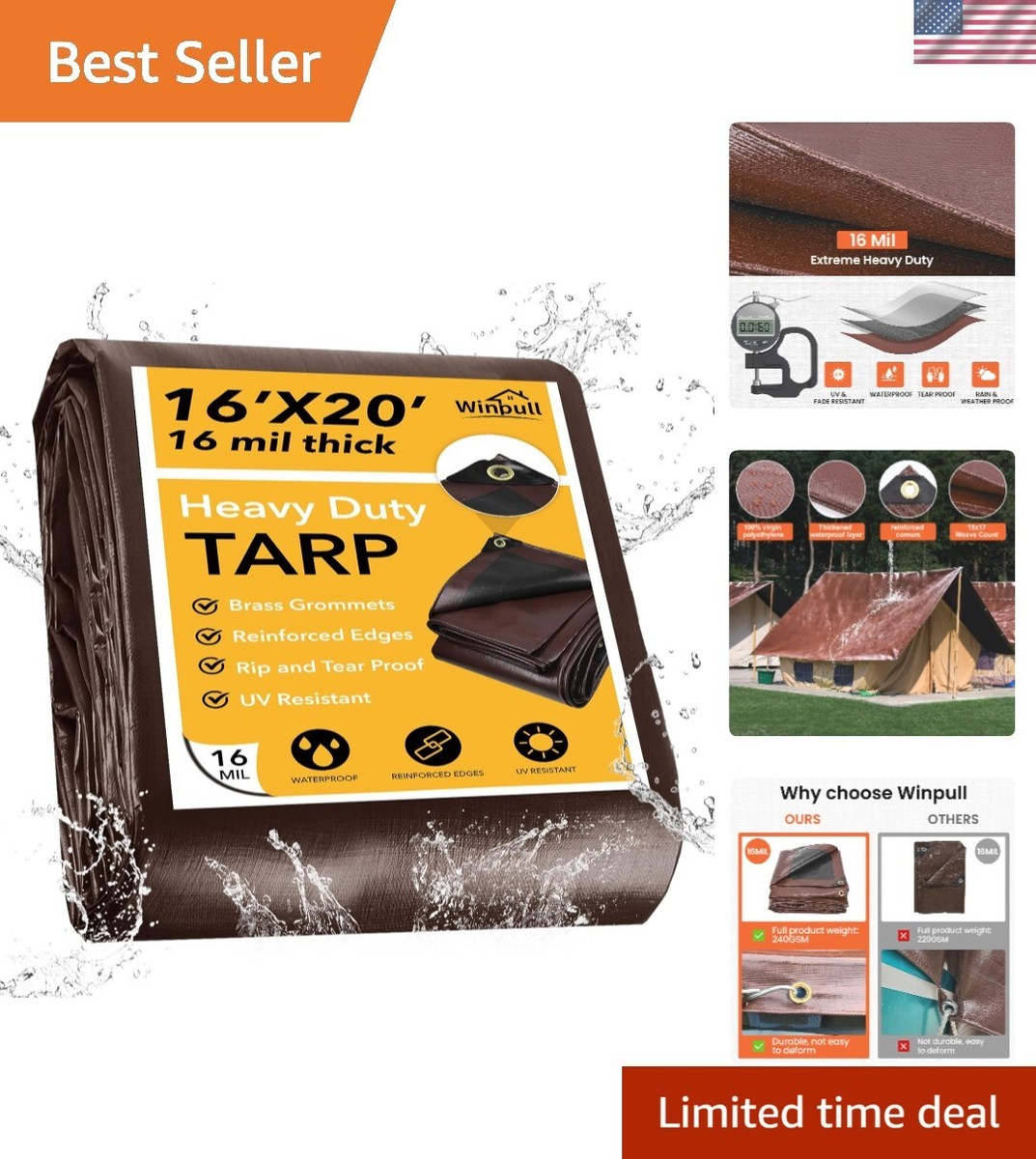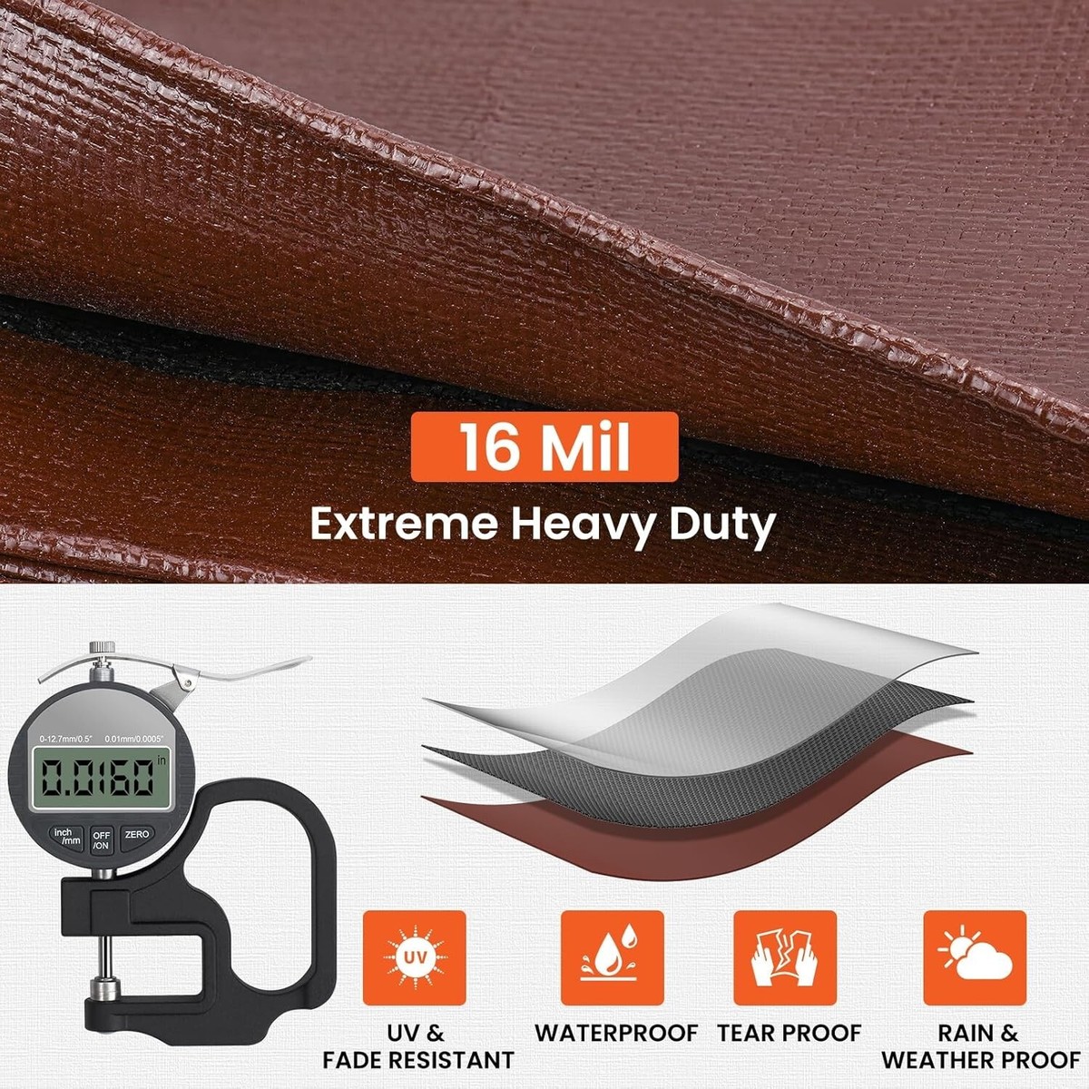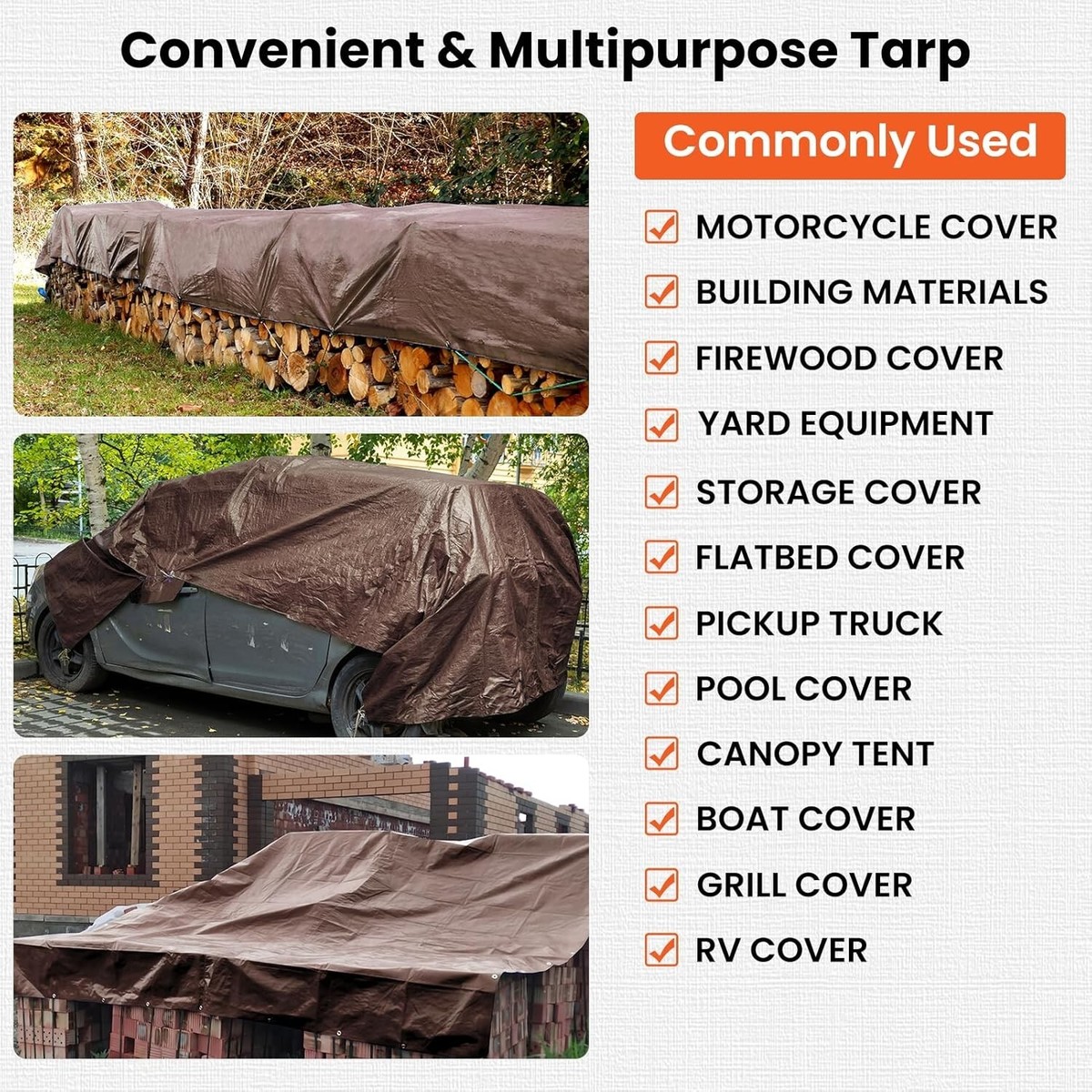 UV RESISTANT, WATERPROOF AND WEATHERPROOF: You can use the ultra-thick tarp throughout the entire , whether it?s windy, raining, snowing or raining. The premium poly tarp can protect your belongings against the forces of nature during heavy rain and snow storms, this brown tarp will keep your stuff as undamaged and dry as possible