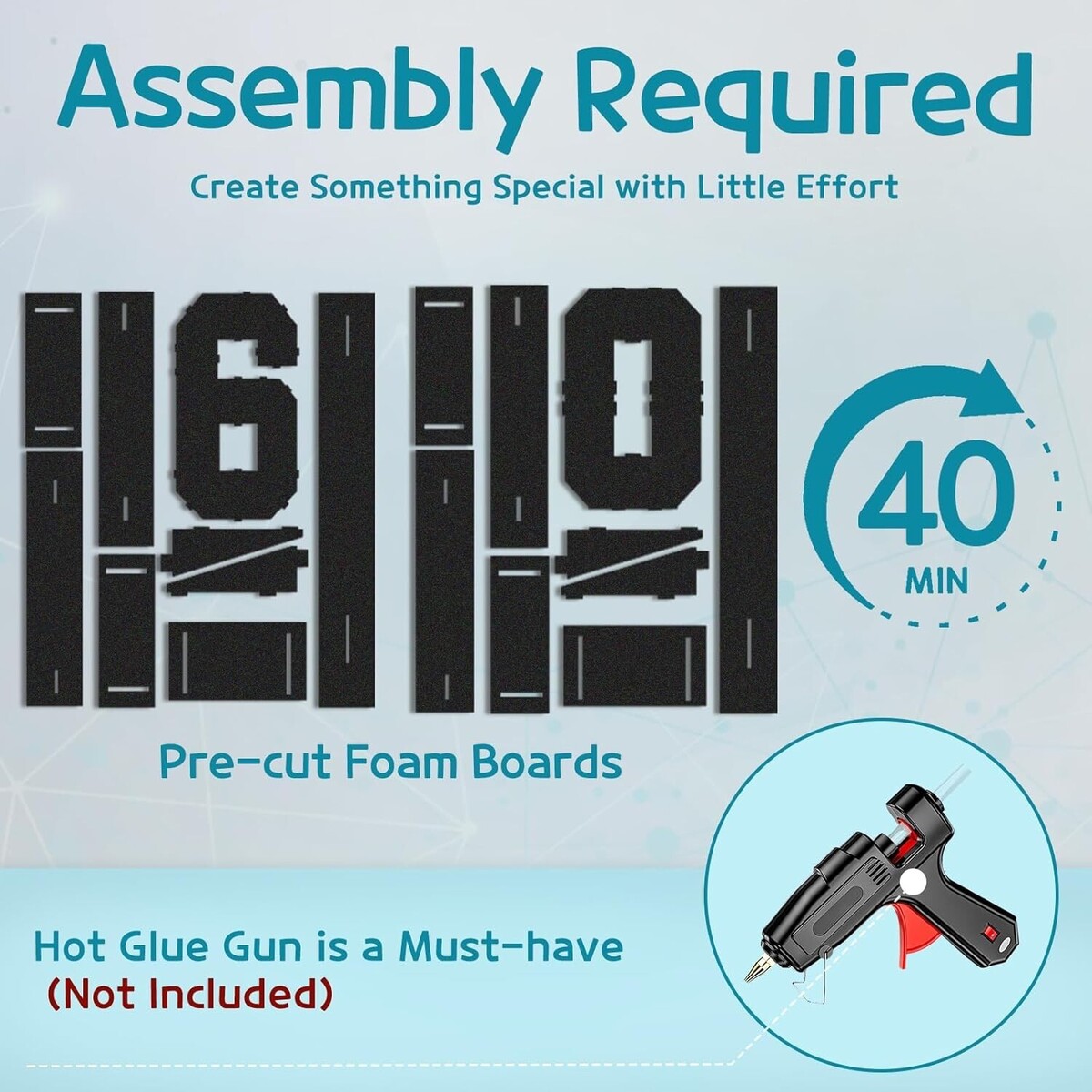 Assembly Required. Large marquee numbers frames are pre-cut foam boards. The instruction guide is easy to follow. Plan and assemble in advance for your party decoration. Devote some of your free time to make your party unique.
