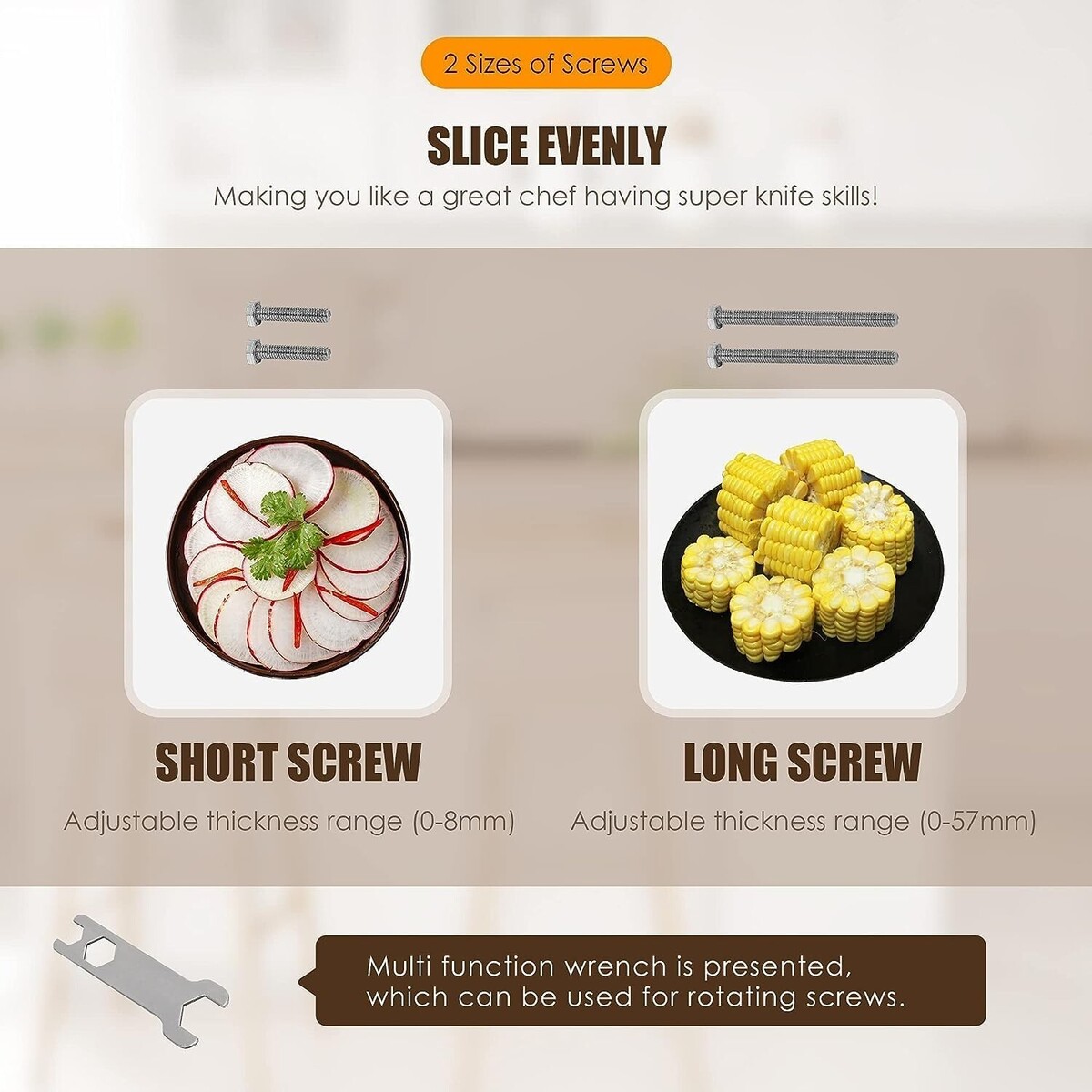 Adjustable Thickness: Includes two sizes of screws for cutting thickness: Long screws for 0-57mm and short screws for 0-8mm, catering to your culinary needs.