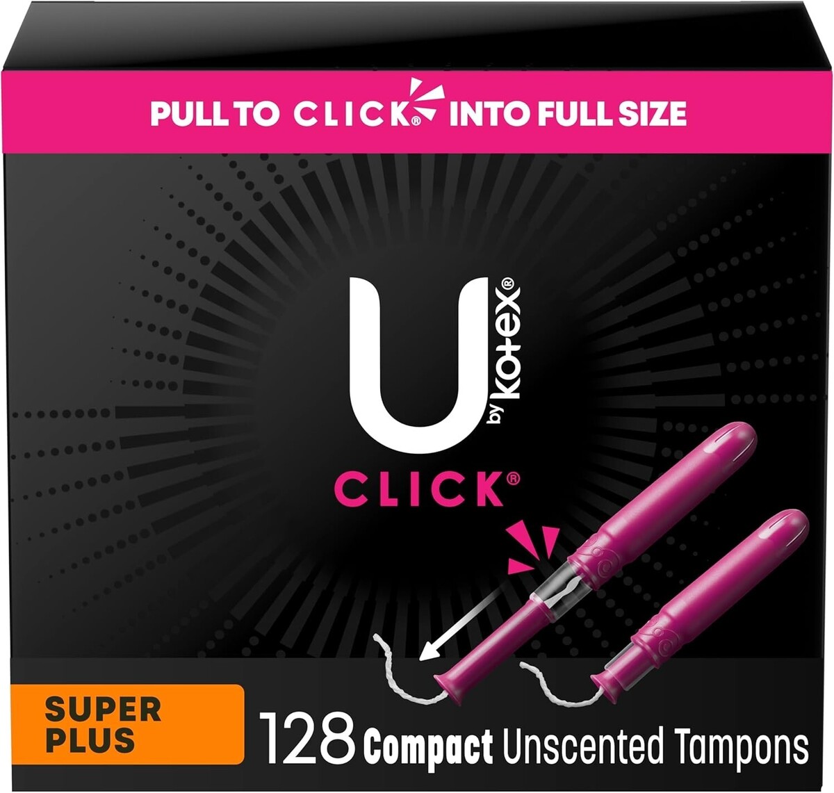Get up to 100% leak-free protection and stay confident throughout your day with Click Compact Tampons! Made without fragrance, Click tampons for women are designed for your comfort and have a smooth tip for easy and comfortable insertion. Each tampon features ComfortFlex grooves that move with y ou for outstanding comfort. Try Click Tampons and see why the #1 compact tampon* is chosen by women every seconds. Pocket-sized and small enough to carry in your purse or pocket, these tampons go from compact to a full-size tampon in one easy step giving you comfortably compact, powerful protection. Pull the lower half of the tampon and when it locks in place, it?s ready to go! Click Compact Tampons are available in regular, super and super plus absorbencies. For backup period protection, try Barely There Pantiliners. feminine products are FSA/HSA/HRA-eligible in the Packaging may vary from images shown.*Based on sales data**Among those with a preference