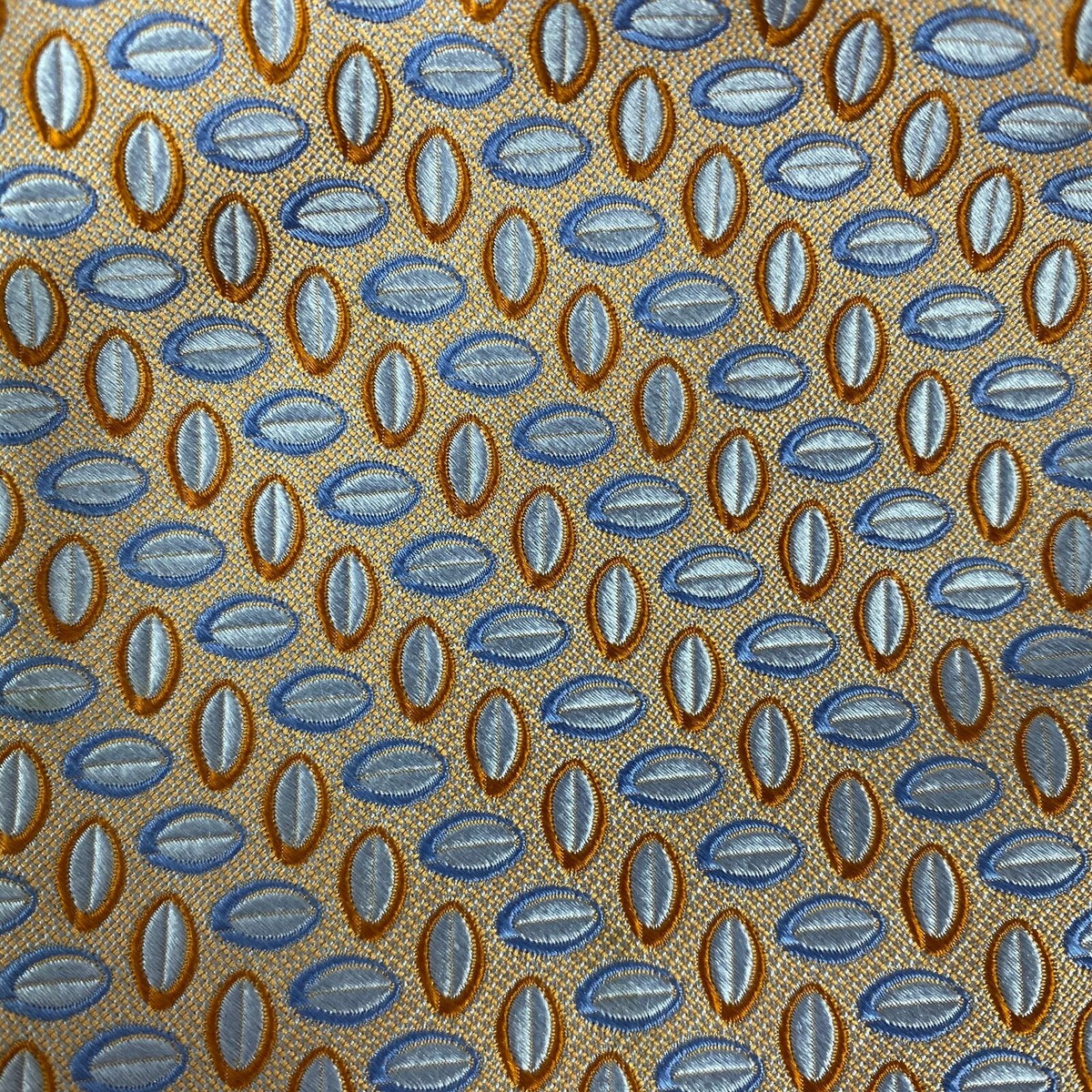 Beautiful tie for your collection. The design looks to be leaves in an oval shape. Blue and orange.