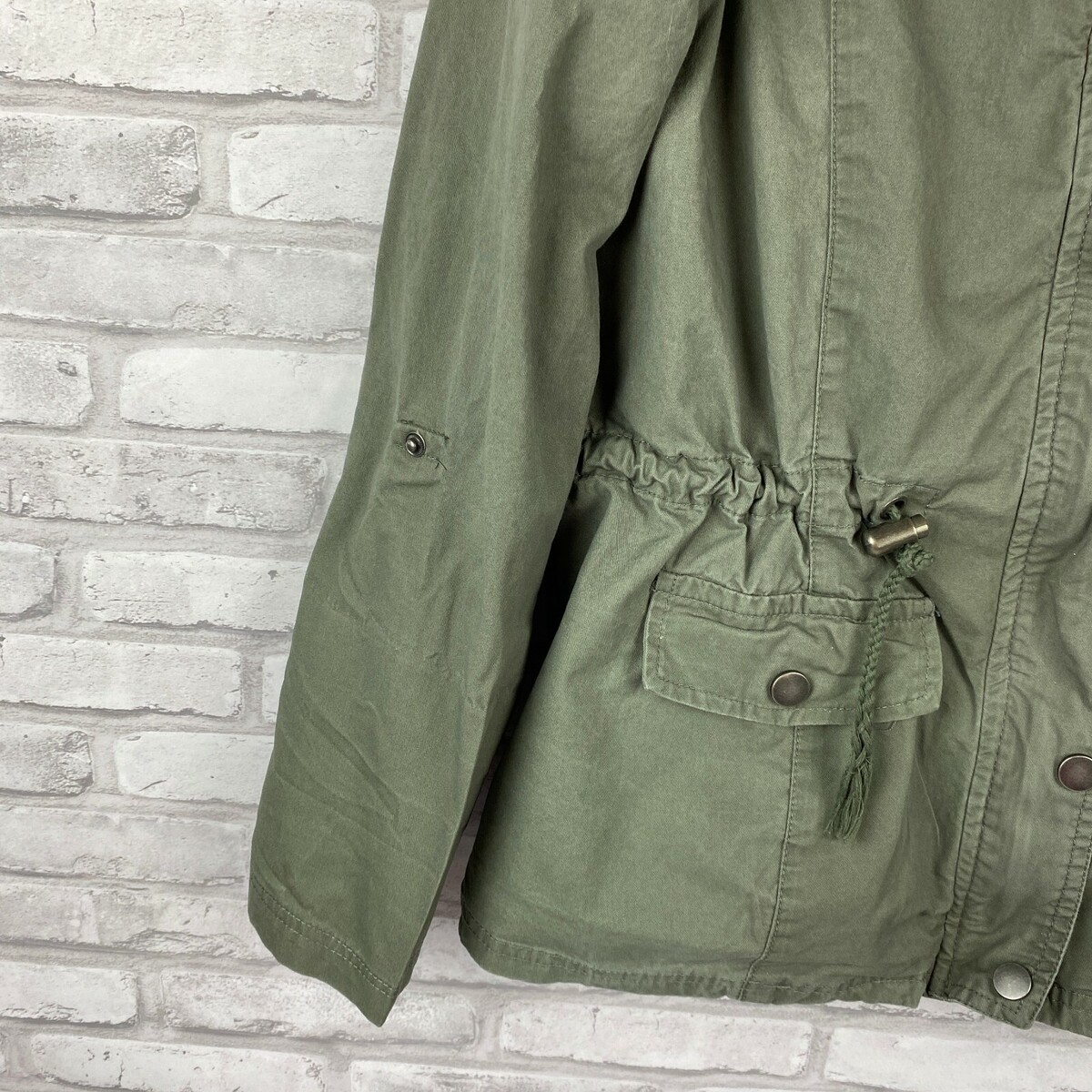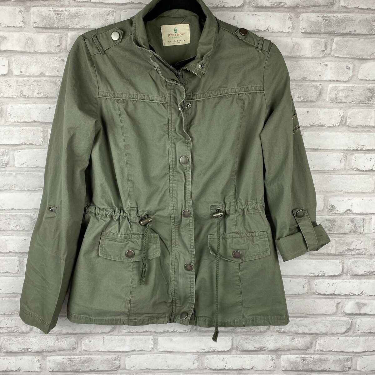 Jade Ivory Military Style Jacket S Coat Full Zip Snap Roll Tab Sleeves Studded