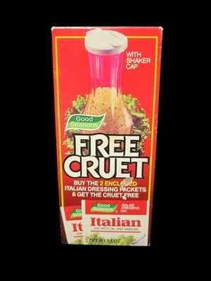 This was a store promotion where customers received a free cruet when buying Good Seasons Italian dressing mix packets. The box advertises the offer and has never been opened. Contents remain factory sealed and unused.