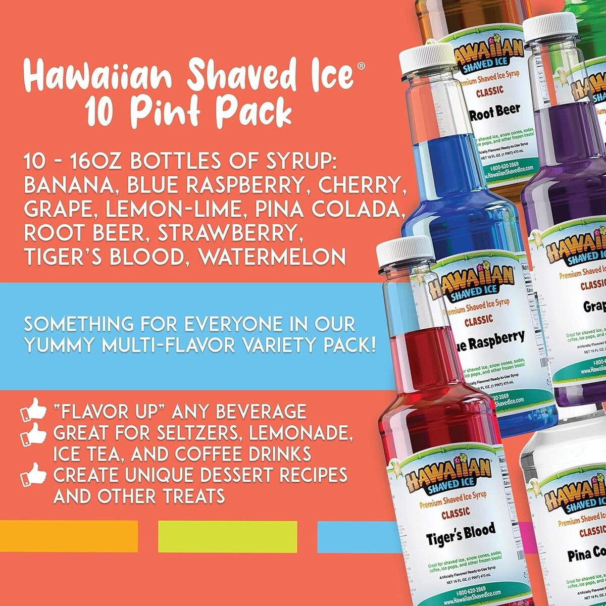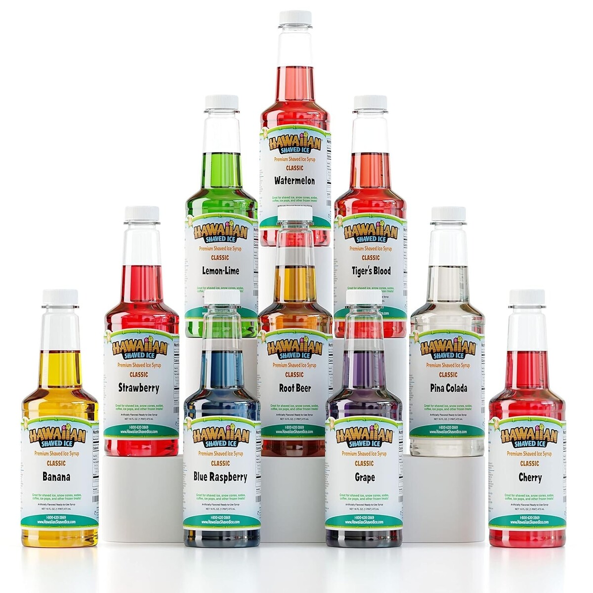 Check out our accessories packs for pour spouts, cups, straws, and everything else you need to complete the party! This 10 - pint pack contains a variety of the most popular flavors of Syrup including pina colada, root beer, blue raspberry, and the county fair staple: tiger?s blood.