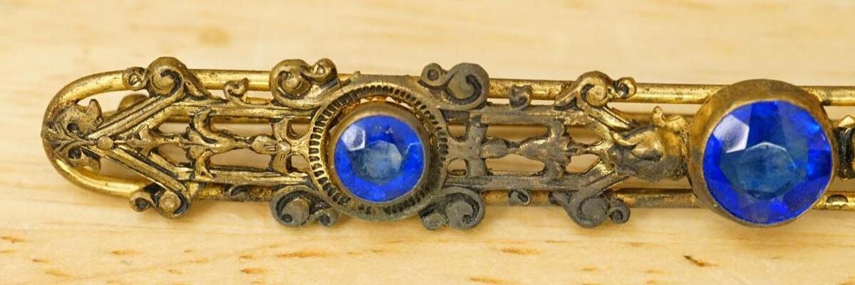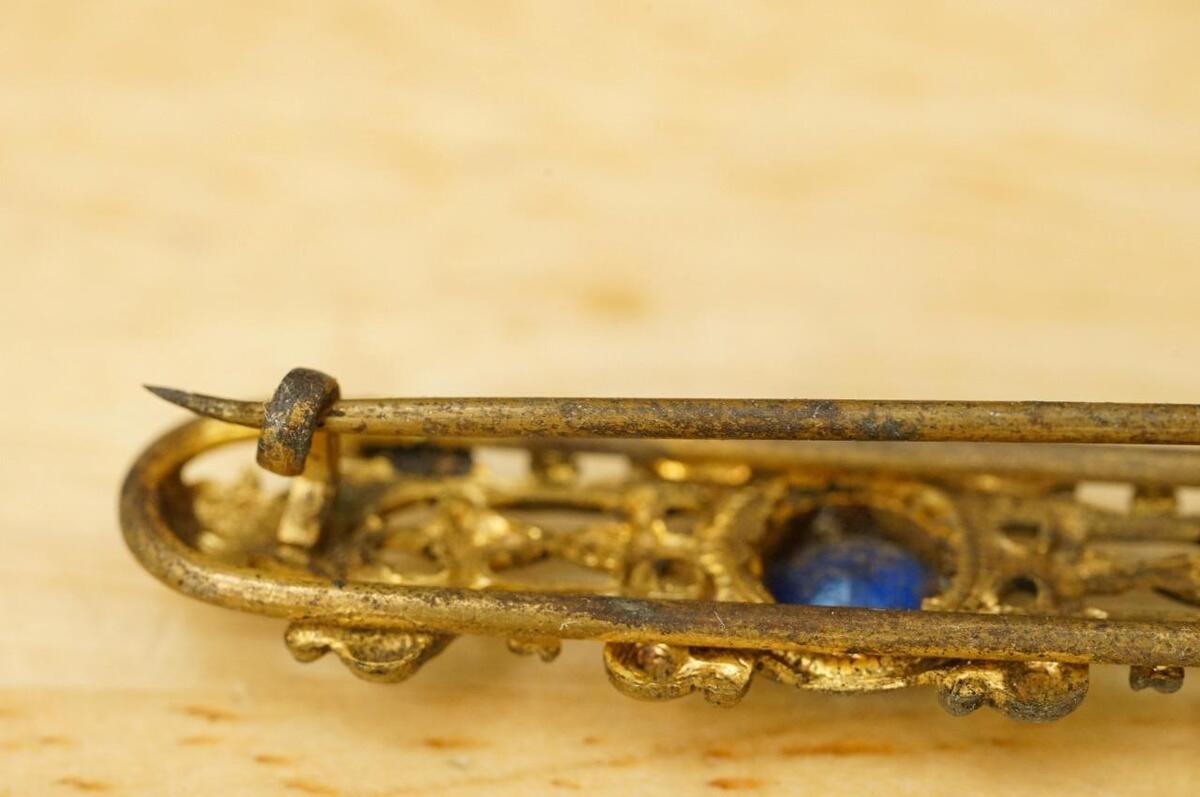 Vintage Estate Jewelry Victorian Blue Glass Brass Bar Brooch Pin 4.25" Long. Needs a gentle cleaning. No smoke or pet odor. Original period piece. C Clasp.