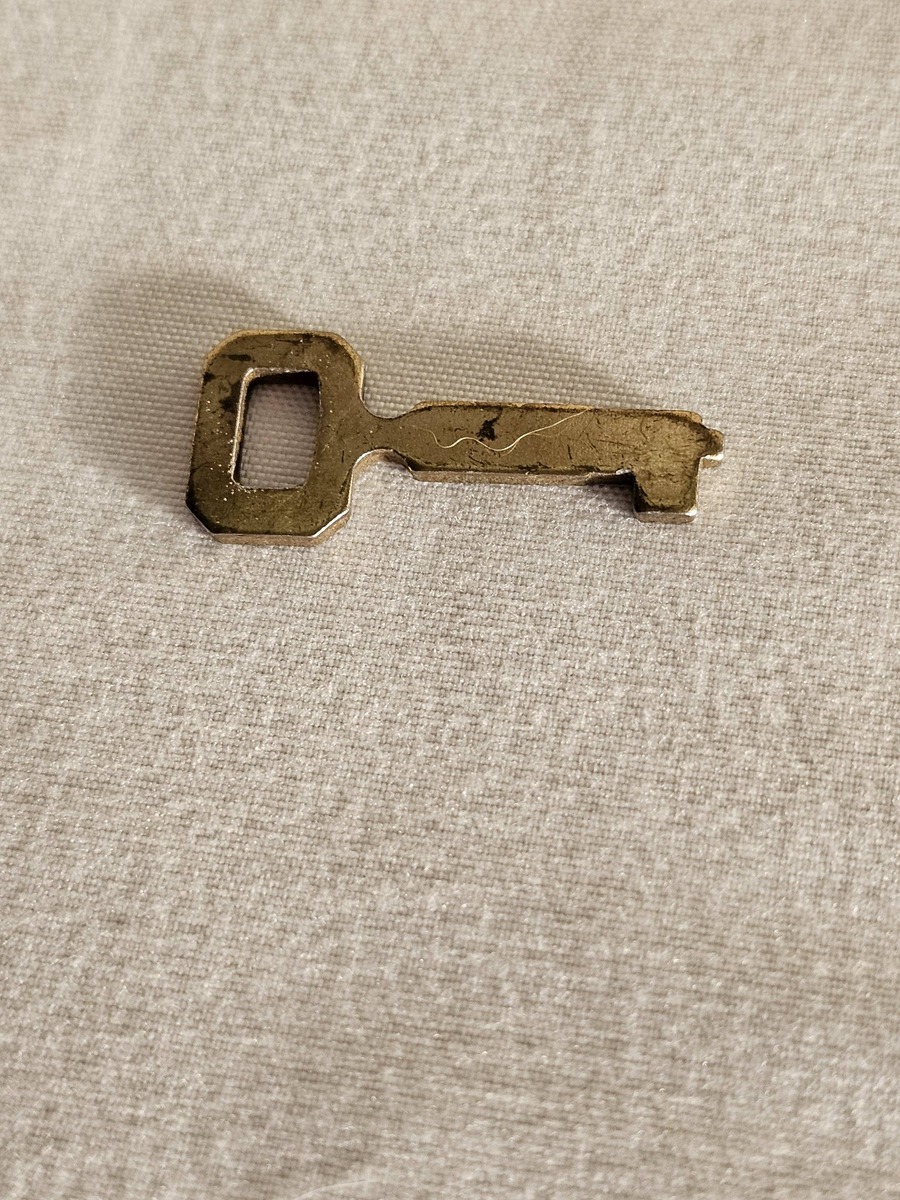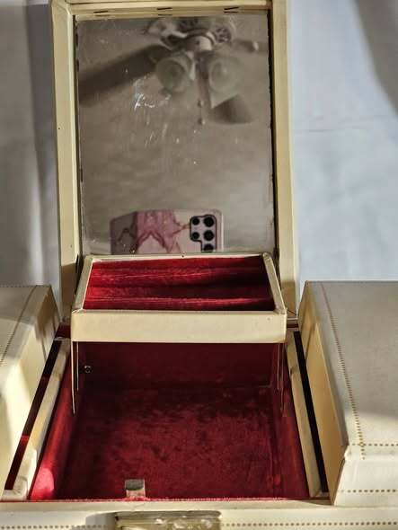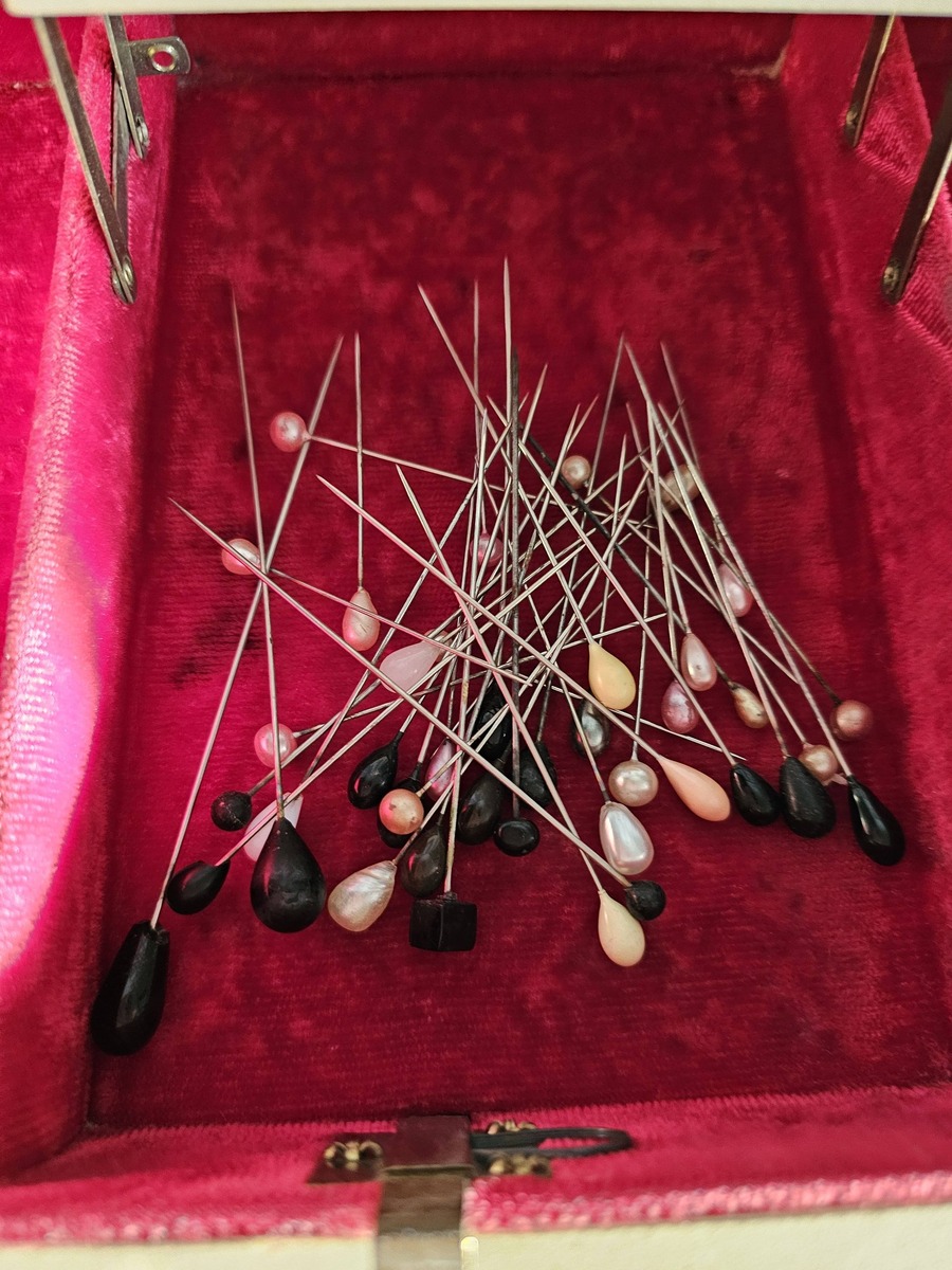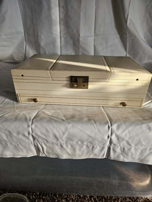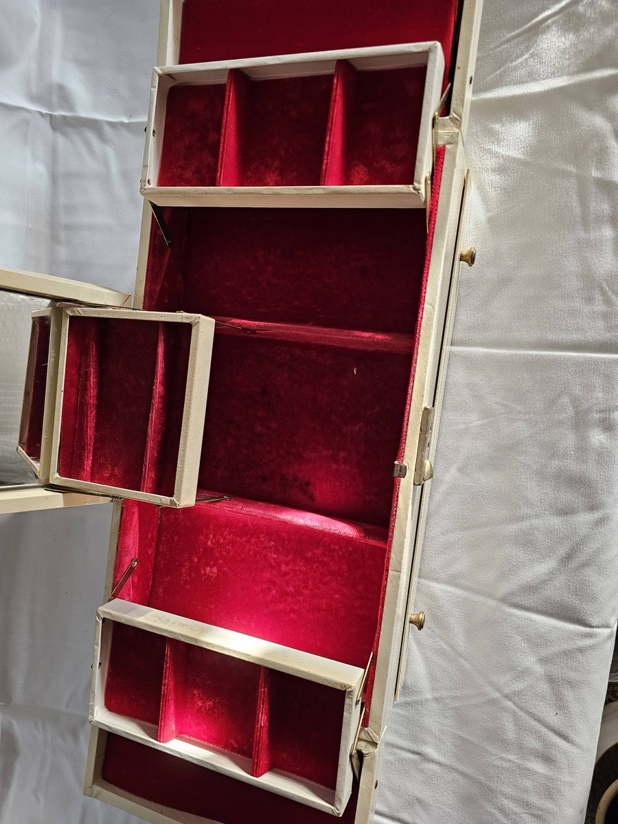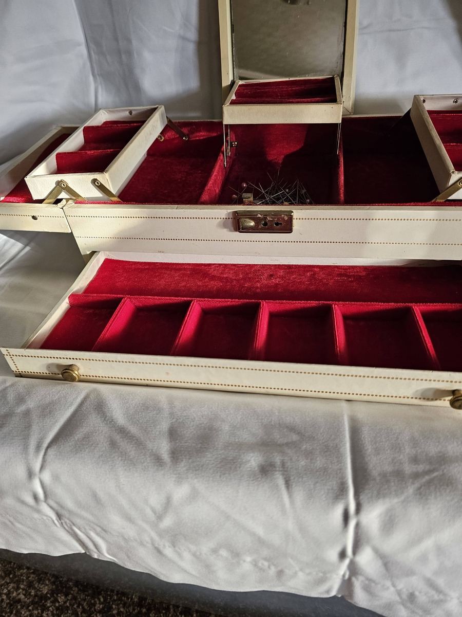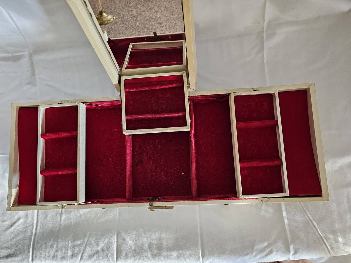 Vintage Cream Jewelry Box Lined in Red Velvet. Click closure works and comes with the key. Great Shape. Also comes with approximately 35 hat pins with different colored pin heads. Size is 14"x8"x4.5" folds out 22".