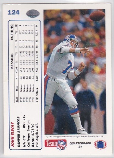 N) 1991 Upper Deck Football Trading Card - John Elway #124