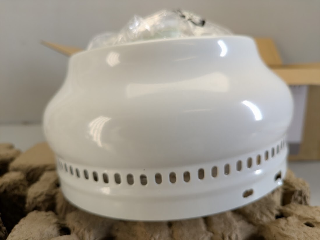 The Littleton 42 in. ceiling fan features a white finish with 4-reversible white/bleached oak blades a frosted glass globe (schoolhouse style shade) for a traditional look that complements a variety of decor styles. This fan is ideal for rooms up to 10 ft. x 10 ft. in size and offers a 3-speed reversible motor to keep you comfortable in any season. It will provide up to 2934 CFM airflow, comes with a pull chain for ease of operation and a 9-Watt LED bulb for your convenience.