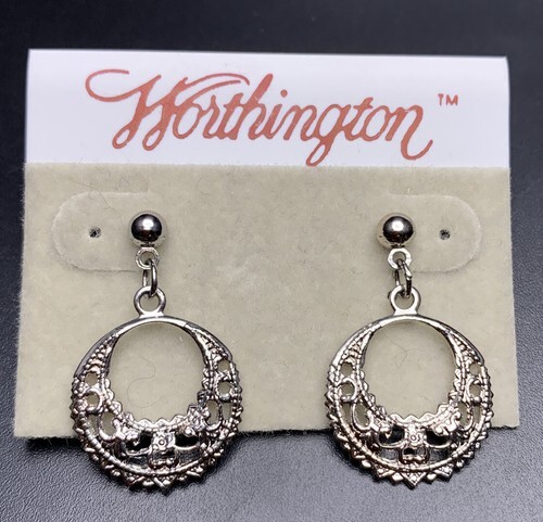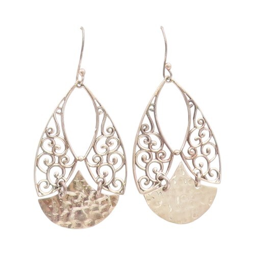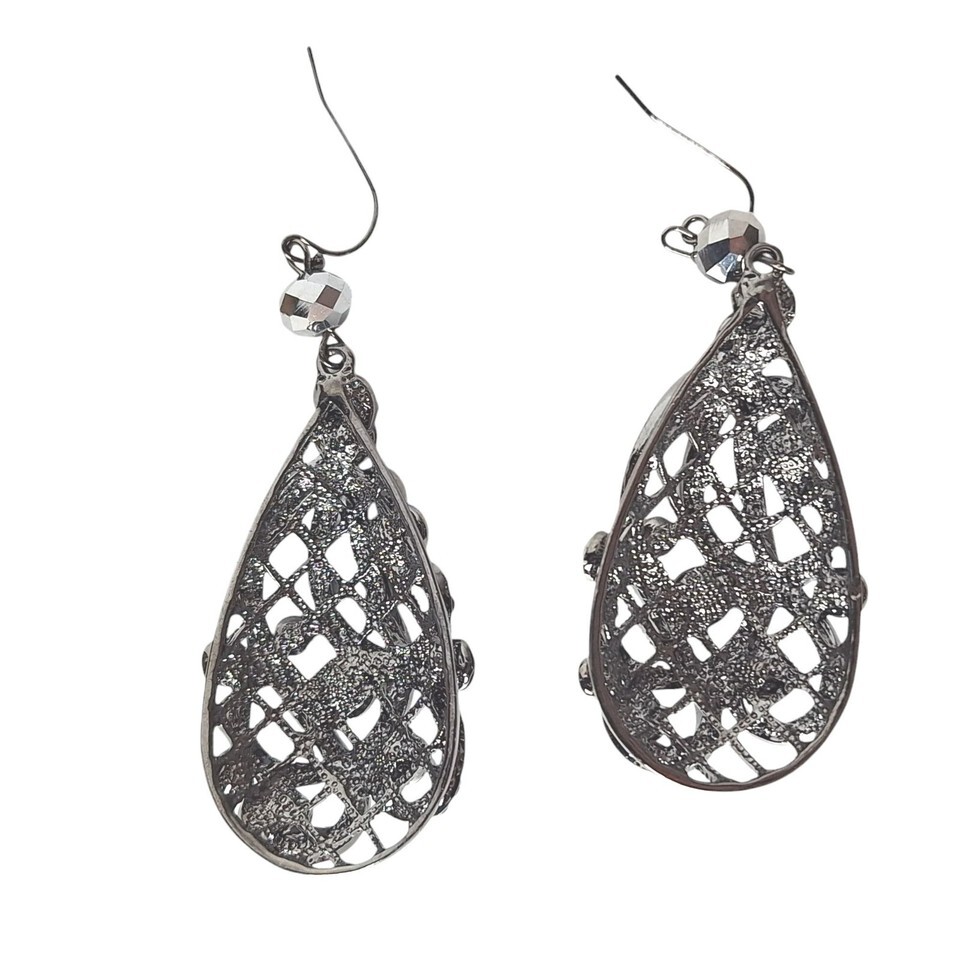 Vintage Filigree Silver Tone Faceted Teardrop Open Faced Dangle Drop Earrings