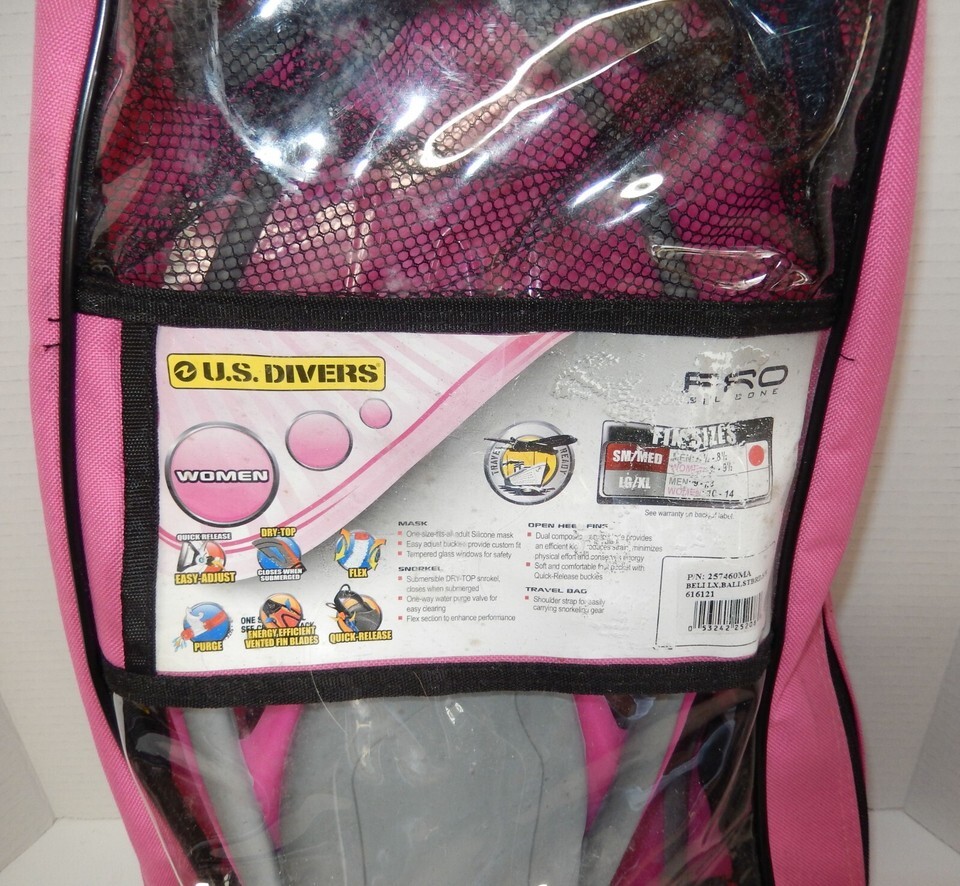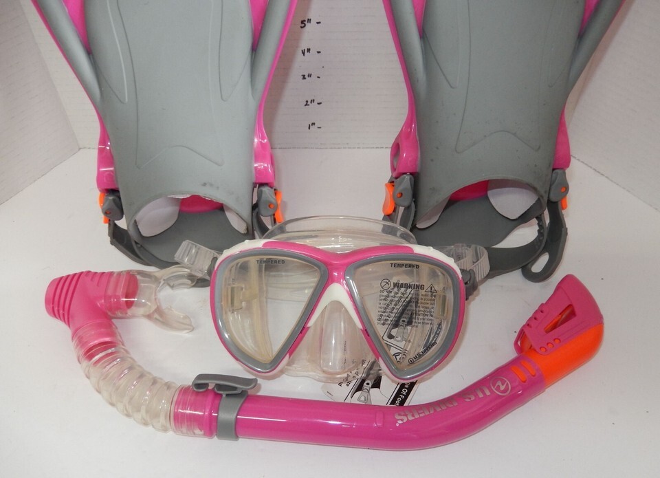 For Sale is a pair of U.S. Divers Women Scuba Diving Fins Pink Gray Size Small 4 1/2 - 8 1/2. its in good used Condition as pictured comes with Goggles Snorkel and travel bag. Please ask Any and All Questions prior to purchasing. Fast Same or Next day shipping with Free Delivery Confirmation within the U.S. Payment Due within 7 days of purchase (if you need more time please let us know In advance) we love to combine shipping is always a Yes and Most of the time Additional Items Ship for free.