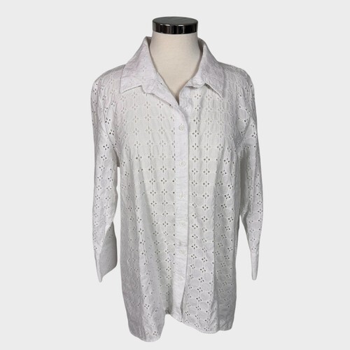The Jones New York Women's Large Blouse is a stylish and professional piece perfect for office and business settings. This Y2K nostalgic top is a classic option for white blouse enthusiasts looking to add a touch of sophistication to their work wardrobe. Made by the reputable brand Jones New York, this blouse offers a timeless design that is both versatile and chic, making it a must-have for any woman's professional closet.
