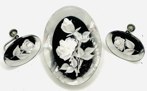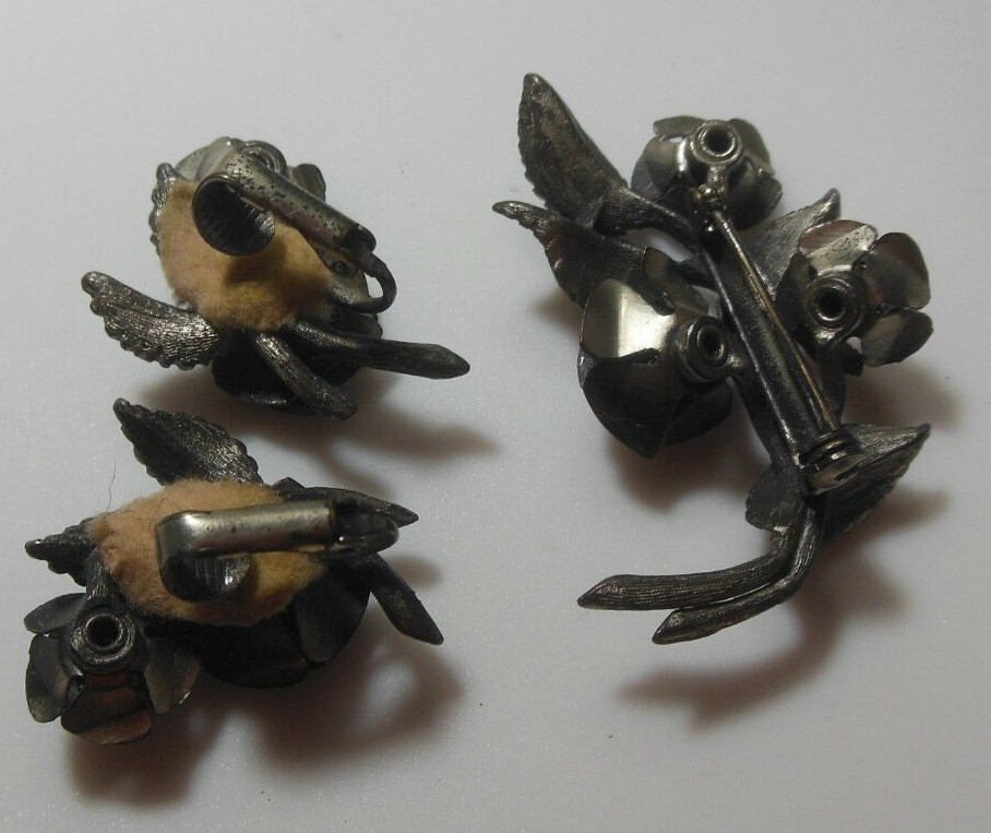 Vintage Silver-tone Rose & Rhinestone Brooch & Matching Clip-on Earrings