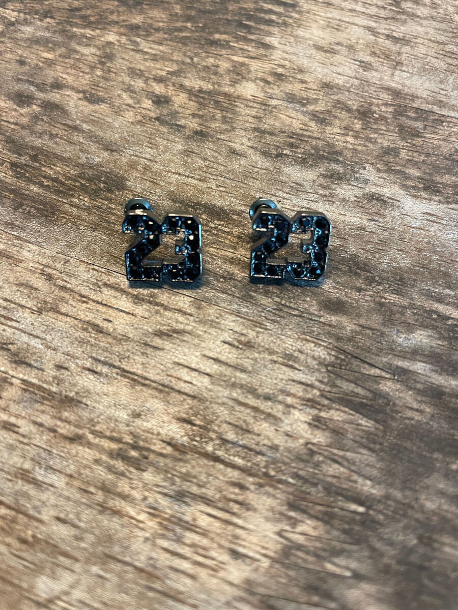 Pierced stud earrings in the shape of number "23," the number of basketball legend Michael Jordan, adorned with black European crystal rhinestones