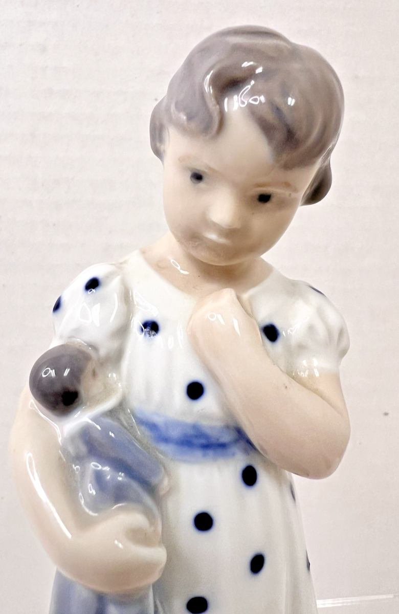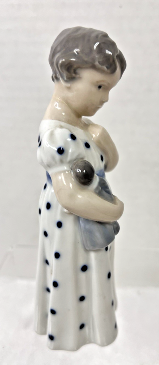 Royal Copenhagen Girl With Doll Figurine 5.5" Blue Spotted Dress