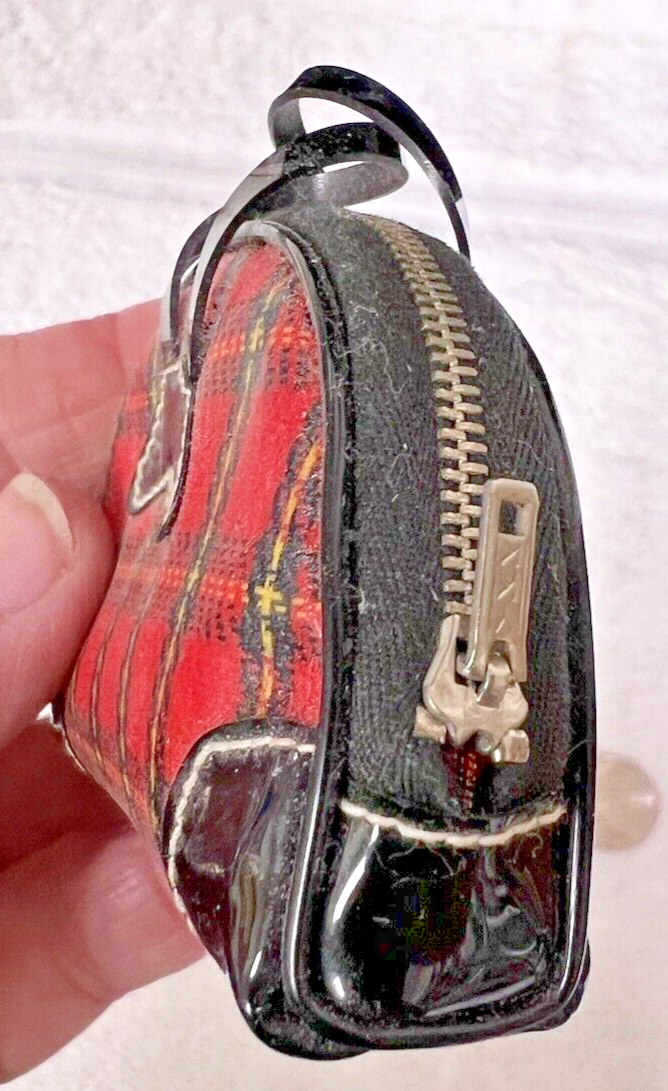 Vintage Tiny Red Black Yellow Tartan Plaid Travel Suitcase 2 3/4 x 2 x 3/4 Inch in nice clean shape ready for a doll we are not actually sure the size dollhouse it goes with....