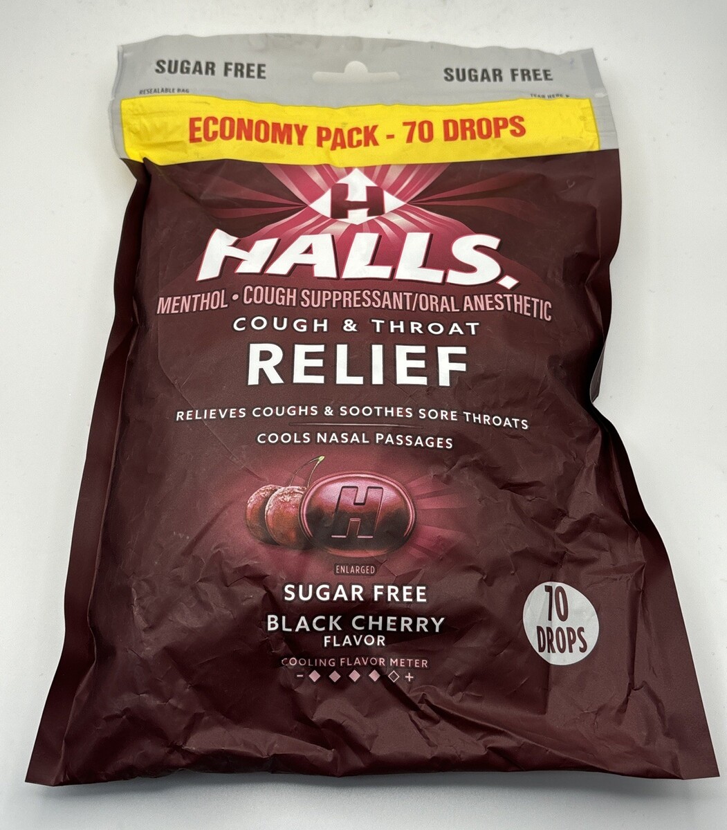 Halls ECONOMY PACK Black Cherry Cough Throat Relief SUGAR FREE 70 Drops