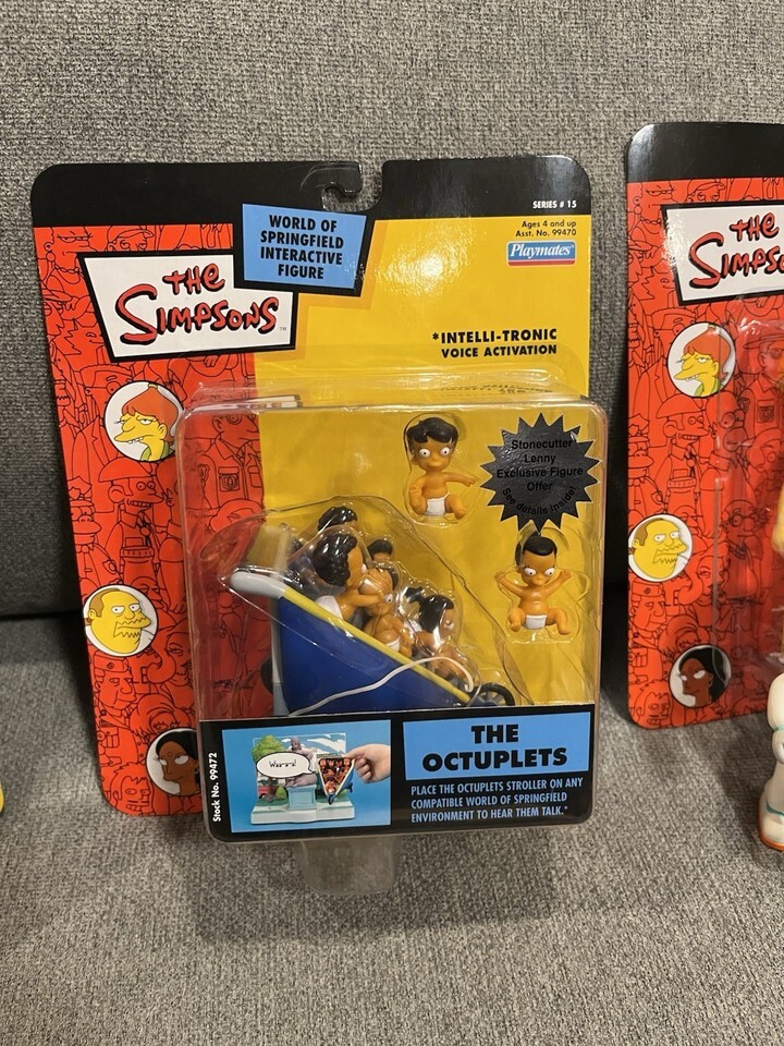 The Simpsons world of Springfield wave 15 figures includes deep space, Homer and Manjula, which are loose, but includes all accessories that were originally included with the package . It also includes the octuplets and Brandine mint in package packages in mint condition. It also includes comic book guy and handsome Moe both in original packaging, but plastic case is pulling away from the cardboard backer.