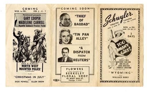 A 6 panel fol dout Schuyler Theatre 1940 Flyer . Located on Columbus Ave in New York City . Includes Too Many Girls with Lucille Ball , Northwest Mounted Police with Gary Cooper and The Letter with Bette Davis and more