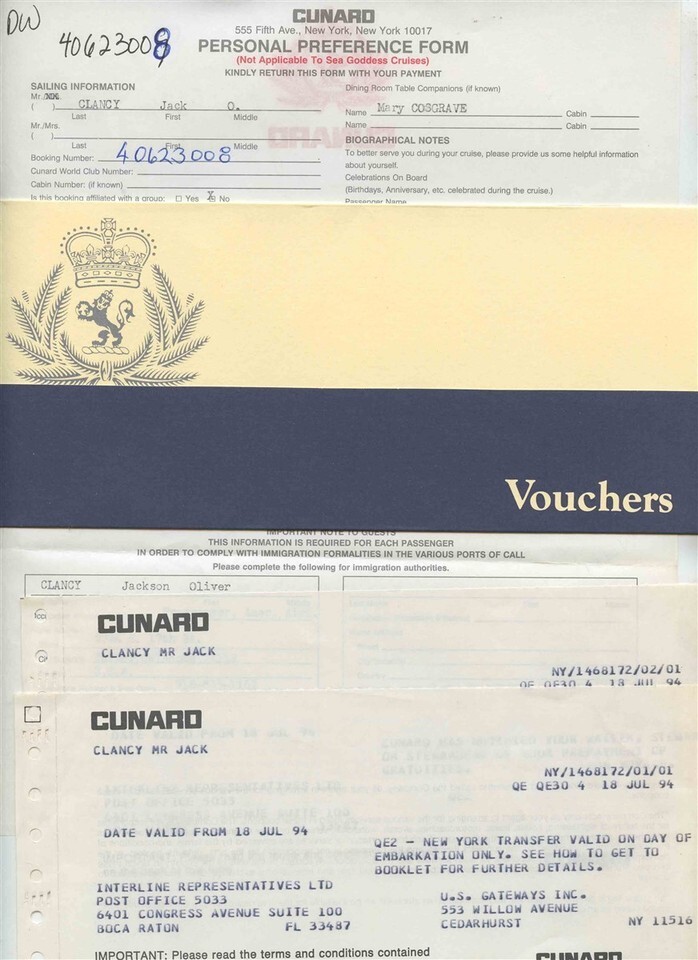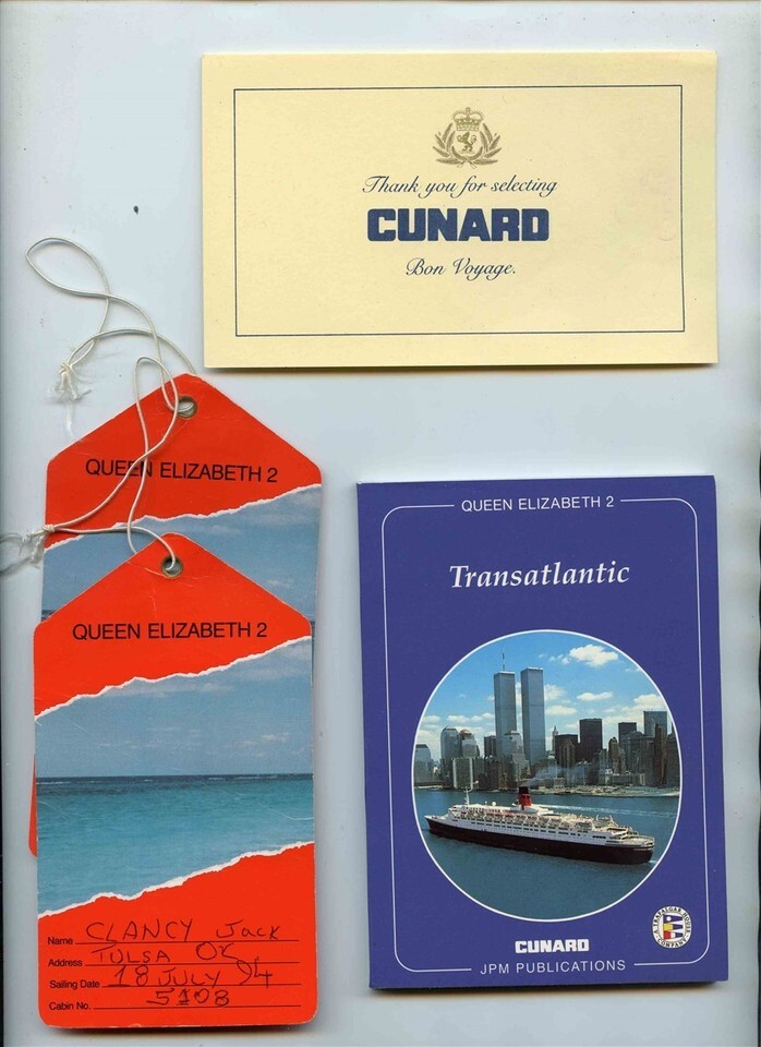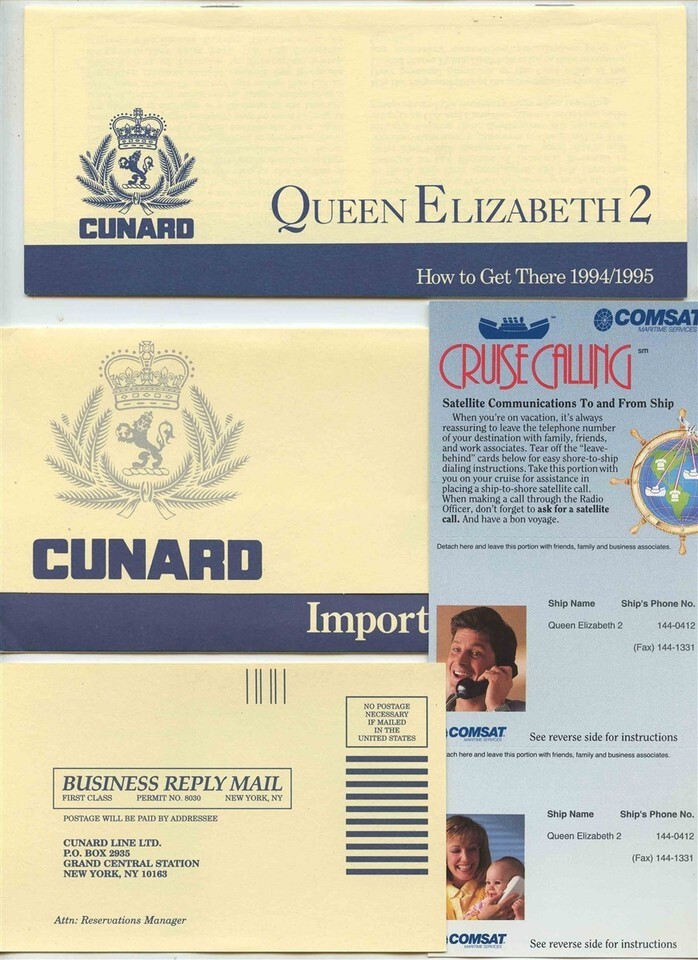 There is a plastic Cunard Folder in this lot which contains a Thank You for Selecting Cunard Card,2 Queen Elizabeth 2 Baggage Tags, A Queen Elizabeth 2 Transatlantic Guide Book, A Cunard Vouchers folder with 2 vouchers and a Personal Preference Form and a Cunard important Information Folder with Cunard Queen Elizabeth2 How to Get There 1994/ 1995 booklet , A survey Card and a Comsat Cruise Calling Card.