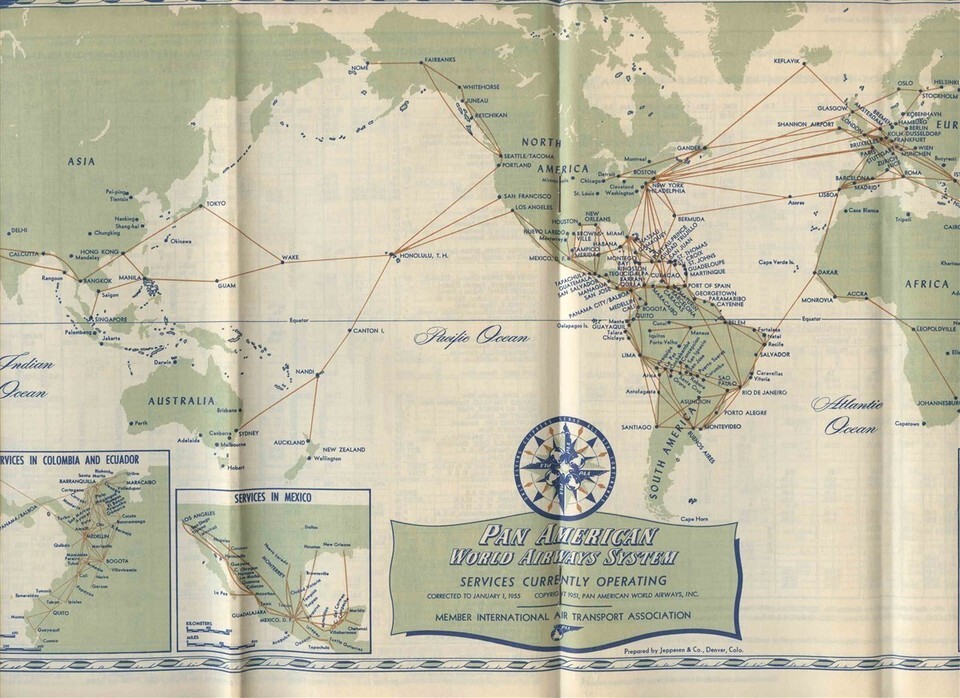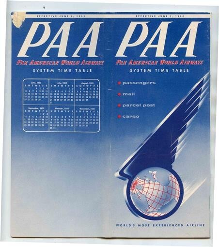 A Pan American World Airways System Time Tables with Passenger, Mail , Parcel Post and Cargo Information and World Wide Route Maps. From June 1, 1955. In English. The System of the Flying Clippers, The World's Most experienced Airline.
