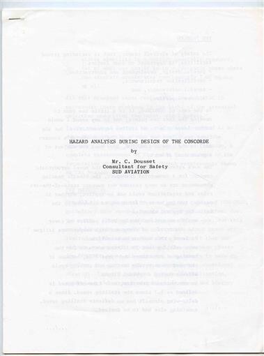 A 20 page illustrated and stapled document. Hazard Analysis During Design of The Concorde by C Dousset , Consultant for Safety, Sud Aviation . Circa 1960's