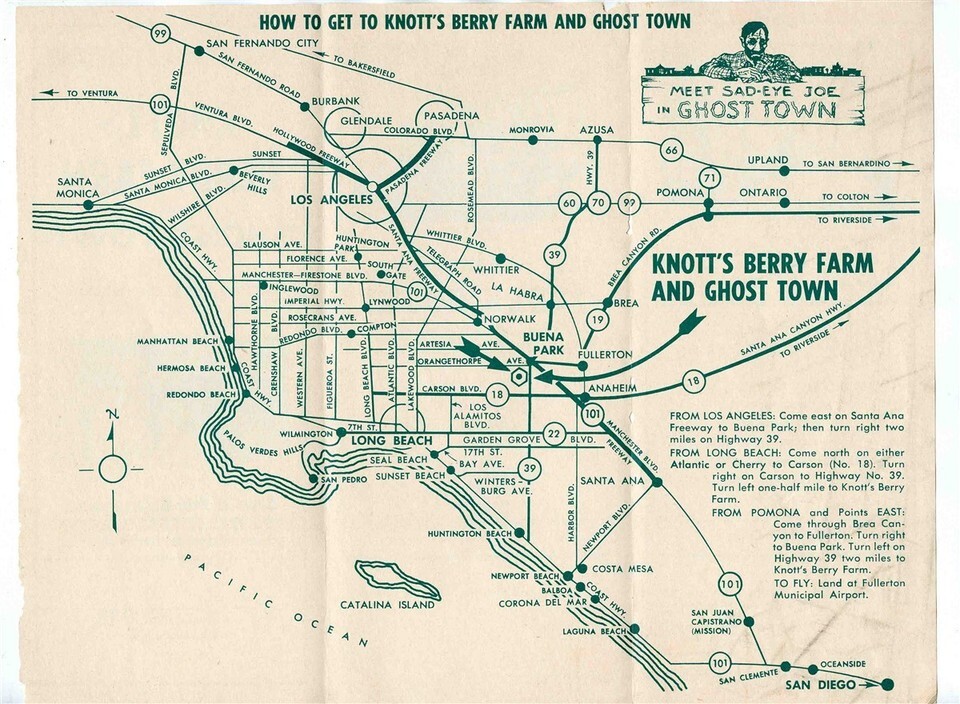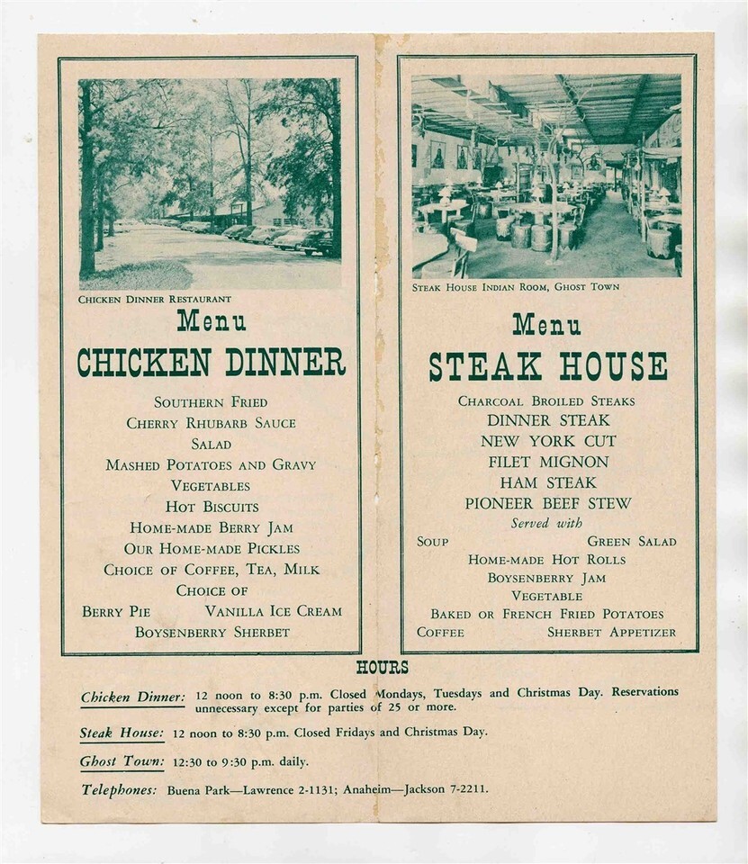 A Pre Disneyland 6 panel fold out with area map and directions on one side and A Chicken Dinner Menu, A Steak House Menu , pictures and more on the other side. Knott's Berry Farm and Ghost Town Information Directions Brochure Buena Park California 1950's Pre Disneyland