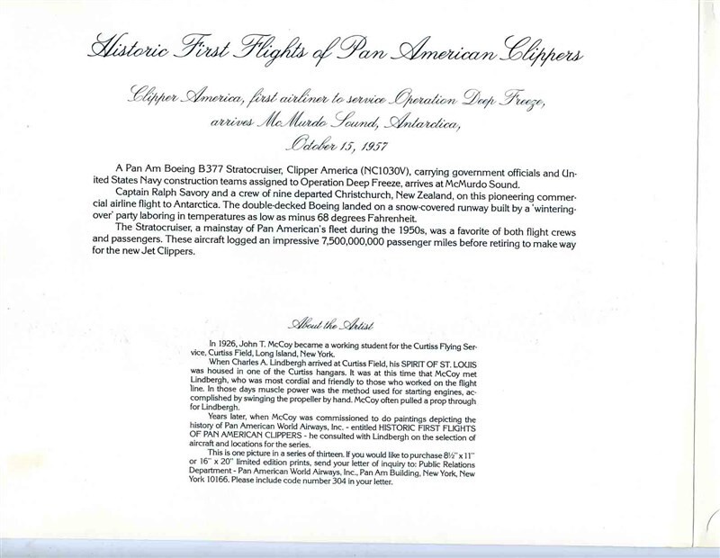 A Pan American World Airways First Class Menu.. Pan American Clipper America, first airliner to service Operation Deep Freeze, arrives McMurdo Sound, Antarctica, October, 15, 1957, a Boeing B377. The cover print is by John T McCoy. On the inside cover is information on the B377 and the artist. In very fine condition, measures about 11" x 8 1/2" when closed. In this menu cover is a 4 page menu in Spanish and English. Has a page of Aperitifs and other drinks and a page of Menu items Dated 1983. A Historic First Flights of Pan American Clippers Menu