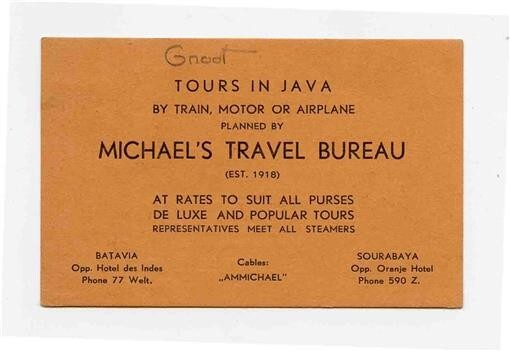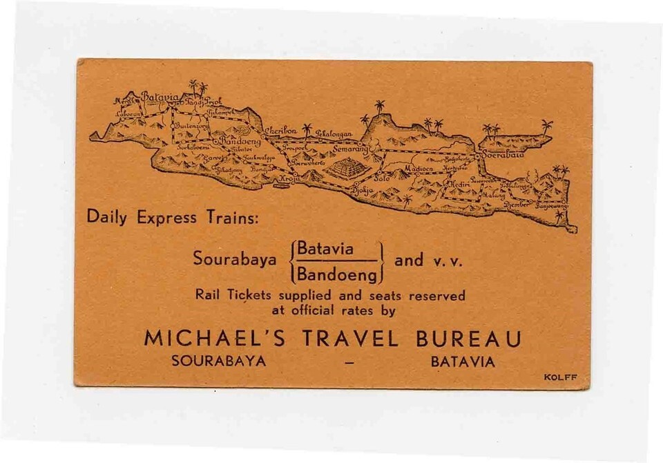 A 2 sided business card with map of JAVA with railroad Route Map on one side. Michael's Travel Bureau Business Card 1930's Batavia Sourabaya Java
