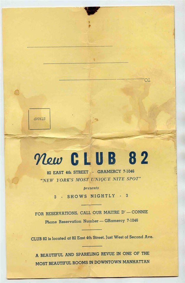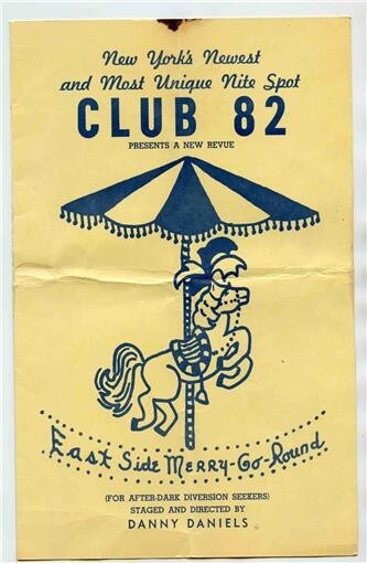 A souvenir program from New York's Newest and Most Unique Nite Spot. Club 82 presents a new revue, East Side Merry Go Round, for after dark diversion seekers, Staged and Directed by Danny Daniels, a Tony Award winning Choreographer. The Club 82 was located at 82 East 4th Street, just West of Second Avenue. Club 82 also known as 82 Club was a famous drag club in New York City. This program is circa late 1950's to early 1960's. Quite scarce. The performers were all female impersonators. Owned by the Mafia.