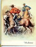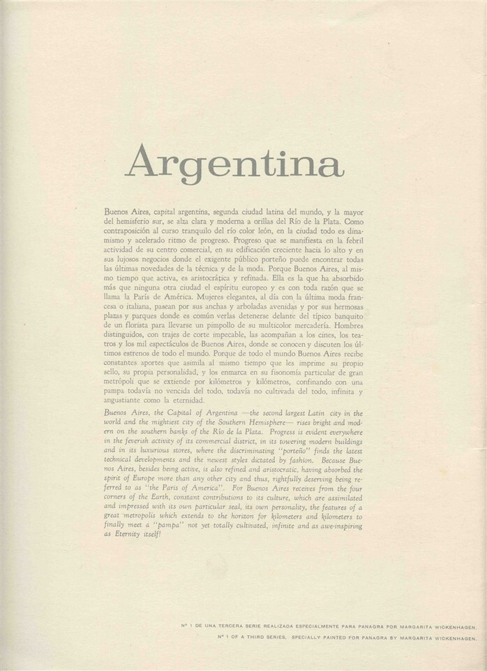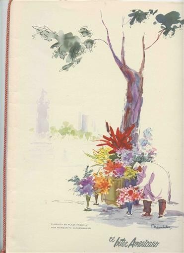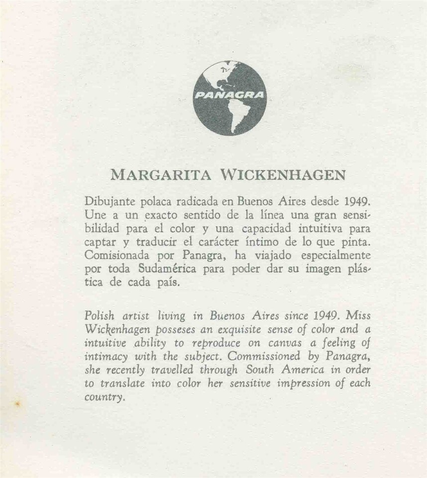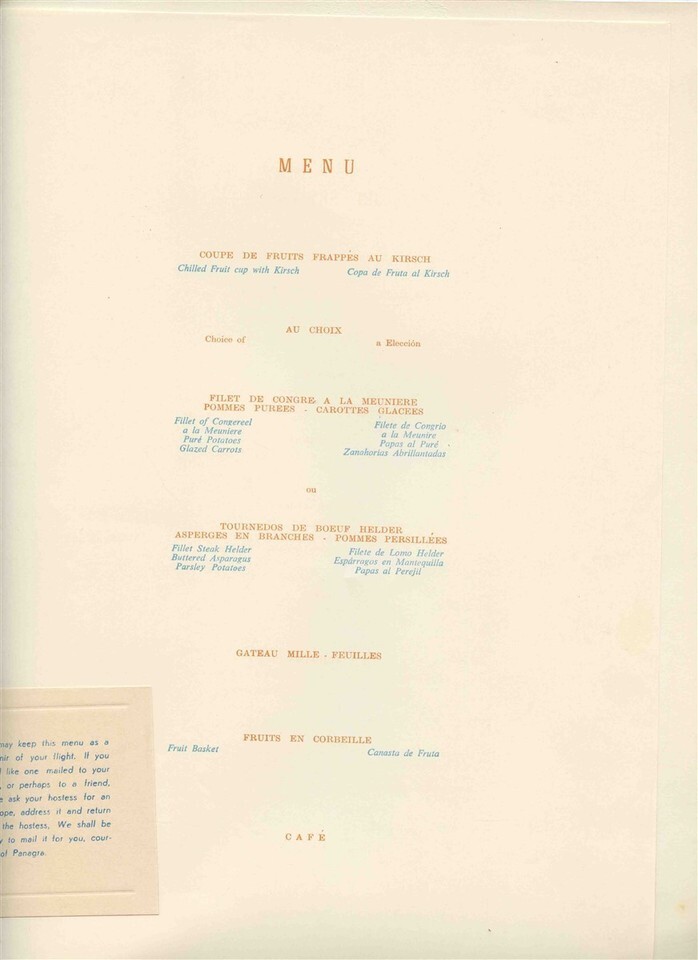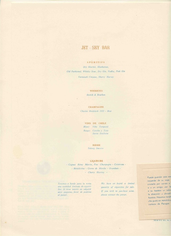 A Panagra El Inter Americano Fiest lass menu for a flight in the early 1960's. The cover art is by Margarita Wickenhagen. The cover is No 1 of a series and is Florista En Plaza Francia and represents Argentian. Measures about 12" x 9 " when closed. Menu held into the cover with a yellow tassel. In French, English and Spanish. The DC-8 was introduced in 1960 and in 1965 the routes were sold to Braniff.