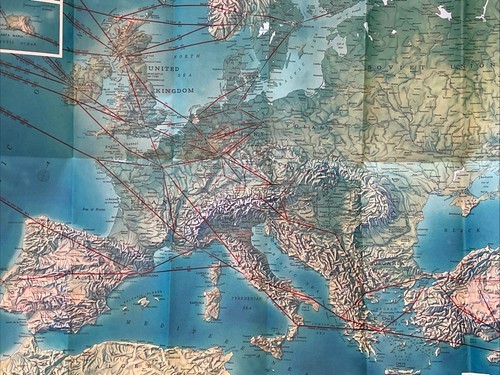 A large 4 page Pan American World Airways Menu Amerique Du Nord, with a map of North Central America and Mexico on the cover. For President Special Service with Pan American Cuisine by Maxim's of Paris. In fine condition, This is a 1964 revision of this menu cover which first appeared in 1951. Amerique du Nord et Centrale. Measures about 9 7/8" x 12 1/2" when closed. Due to the size limitations of my scanner, the entire menu may not show in some of the scans. Has information on Dietary needs and religious preferences on the back cover.