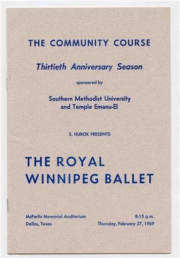 There are 2 items in this lot. An 8 page program from S Hurok Presents The Royal Winnipeg Ballet at McFarlin Memorial Auditorium in Dallas Texas on February 27, 1969. Sponsored by Southern Methodist University and Temple Emanue-El. Plus a newspaper clipping about the performance. A Community Course performance