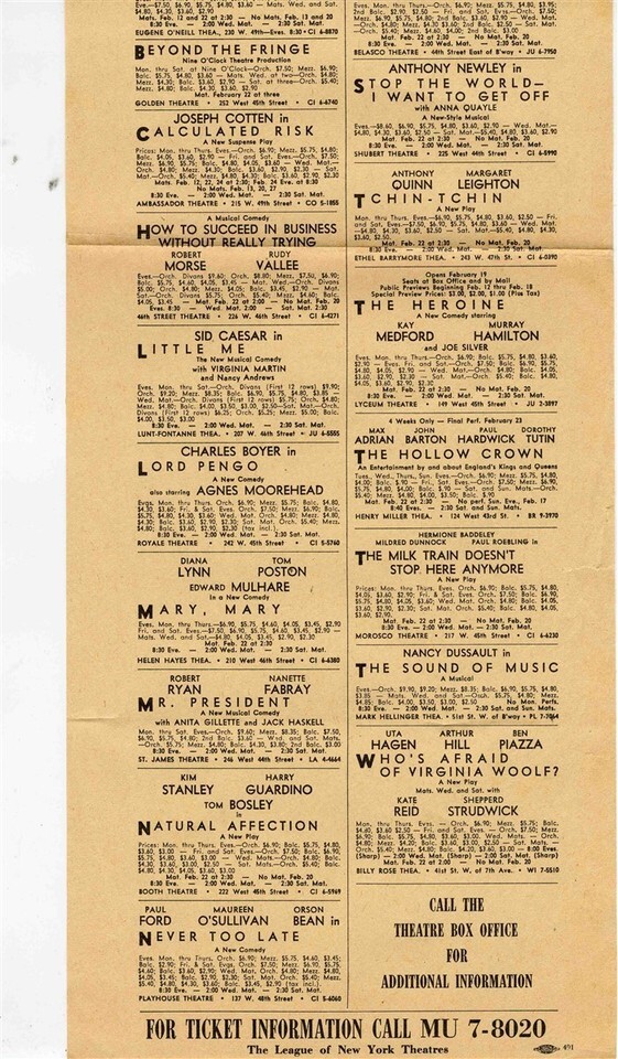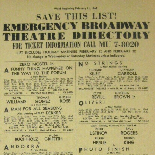 1963 Emergency Broadway Theatre Directory A 1963 Emergency Broadway Theatre Directory dated February 11, 1963 . The Directory lists 24 shows with stars, times, costs and more. Stars on Broadway that week were: Zero Mostel, Jason Robards Jr, Joseph Cotten, Richard Kiley, Diahann Carroll, Peter Ustinov, Sam Levene, Anthony Quinn, Robert Morse, Rudy Valee, Sid Caesar, Tom Poston, Nanette Fabray, Orson Bean and many others.