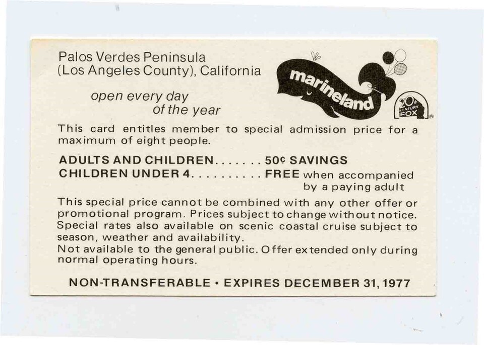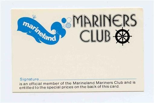 A 2 sided pocket sized card. Marineland Mariners Club Membership Card , expired in 1977. From the Los Angeles California Oceanarium which closed in 1987