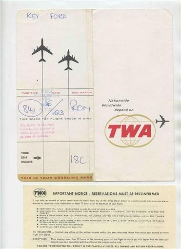 A TWA Ticket Jacket with 2 Forms inserted. From a 1964 flight from Athens Greece to Rome Italy. . Trans world Airlines