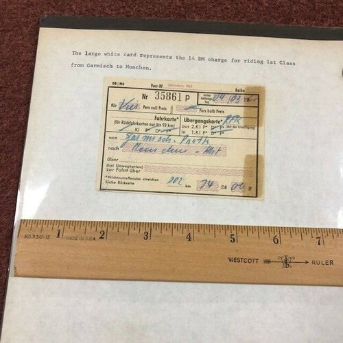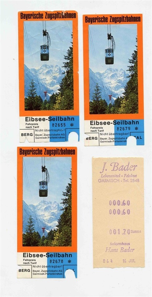 A 2 sided Garmisch Armed Forces Recreation Area Map with "Xed" out Bus Schedule on the back and 3 used Bavarian Zugspitz Railways Tickets. Plus a receipt from J Bader. Darted 1975