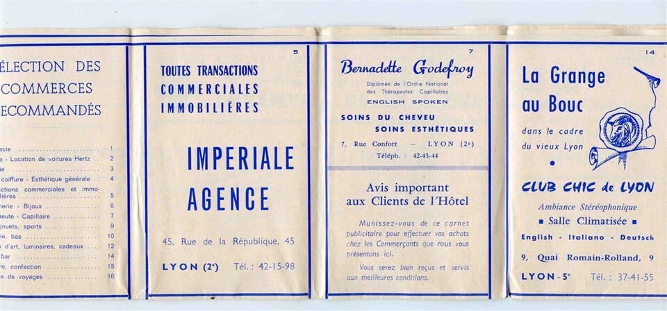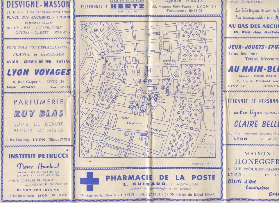 A 32 panel fold out with maps, advertising and hotel information. Carlton Hotel Lyon France Brochure. In French, circa 1950's
